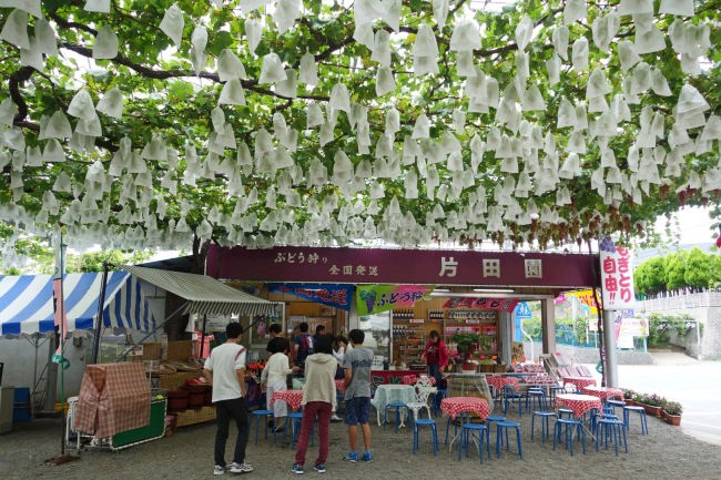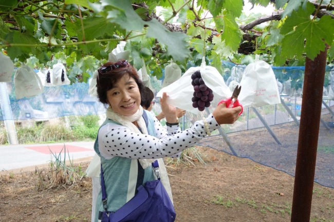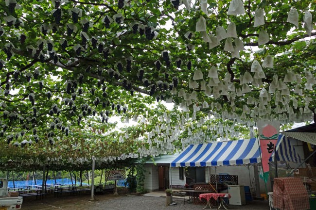 ちょうどブドウのシーズンで、一番上の姉が予約した塩山の温泉の周りにはたくさんのブドウ園があり、ついでに立ち寄ってみました。お店の人に、袋をかぶせるのは大変ですねと言ったら、かぶせるのは簡単で、一番大変なのはまだブドウの実が小さい時に、大きくなった形を想定して間引きをすることだそうです。 |