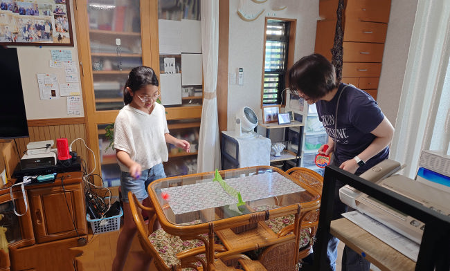 娘と孫が我が家で卓球をしています。おもちゃ屋で卓球道具を買ってきたようです。 |