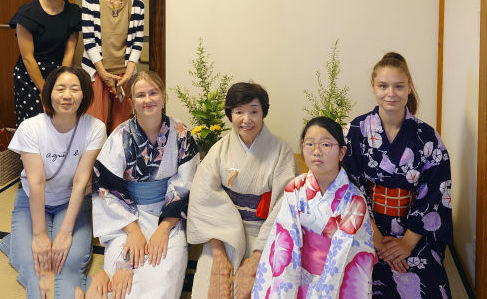 8月初旬 国際間の交流の目的で夏休みの間、外国の人が日本の大学で学びますが、ボランティアさんの家で寝泊りしています。そこの奥さんが日本文化を紹介するため、我が家に連れて来て、家内が半日ほどお花とお茶の話をして過ごしました。この写真は外国からの学生と娘と孫も混じっています。 |