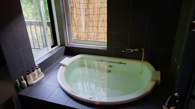 昨夜の台風でたくさんの花が倒されていました。朝食は昨夜と少し離れたところで個室でした。 |