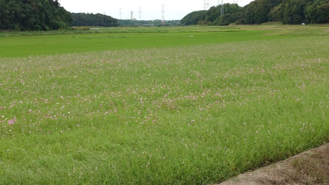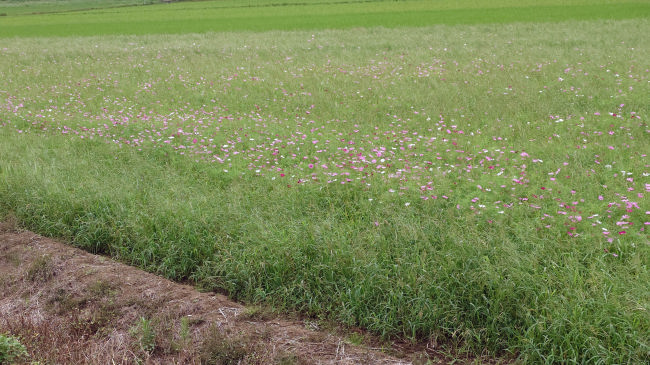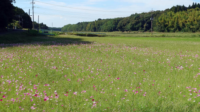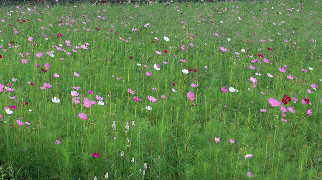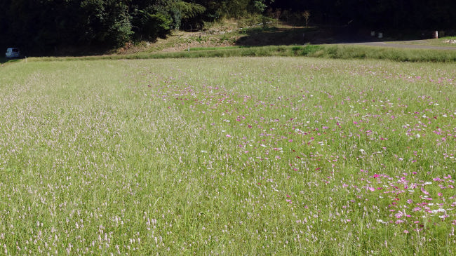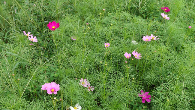 コスモスが花を開きだしました。今年は例年よりも花が少ないようです。ここに花を見に来る人はほとんどいないので、種をあまりまかなかったのかも知れません。 |