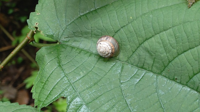 庭の葉にカタツムリがいたので手に取ってみました。なかなか首を出してくれません。(でんでん虫々かたつむり、おまえの頭はどこにある。ツノだせヤリだせ頭だせ) |