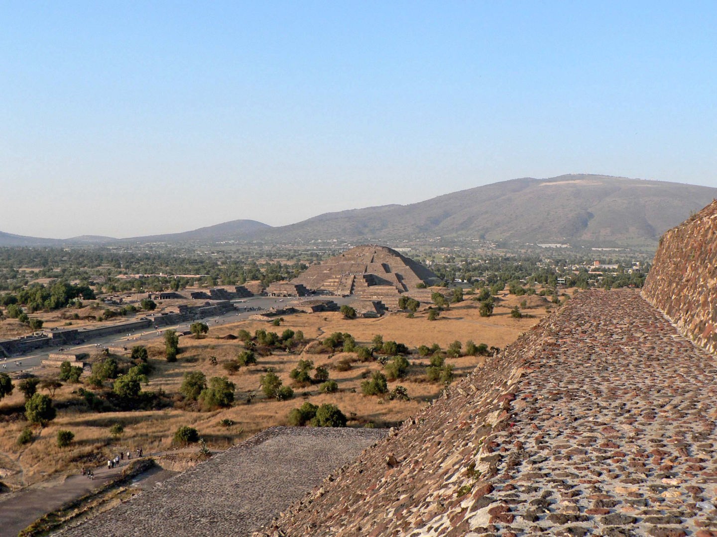 アステカ人は廃墟となった巨大なピラミッドを目にし、神々が太陽と月をここから作り出したと考え、太陽のピラミッドと名付けました。アステカ人にとって、太陽は信仰の中心でした。 高さは65mで、その高さは世界第3位です。(1位と2位はエジプト) 階段だけでも248段あります。高さではエジプトのピラミッドに劣るものの、その容積は世界一です。 このピラミッドは西暦100年ごろに建造されました。当時は頂上に木造の茅葺屋根の神殿がありました。 完成までに、一日数千名の労働者を使っても50年は必要だったと推定されています。 1971年、このプラミッドの中心部の下から天然の洞窟と宗教色の強い器物が発見されており、ピラミッドの建設以前から、神域として崇拝されていたようです。 頂上まで登ってみました。遠くに月のピラミッドが見えます。 |
