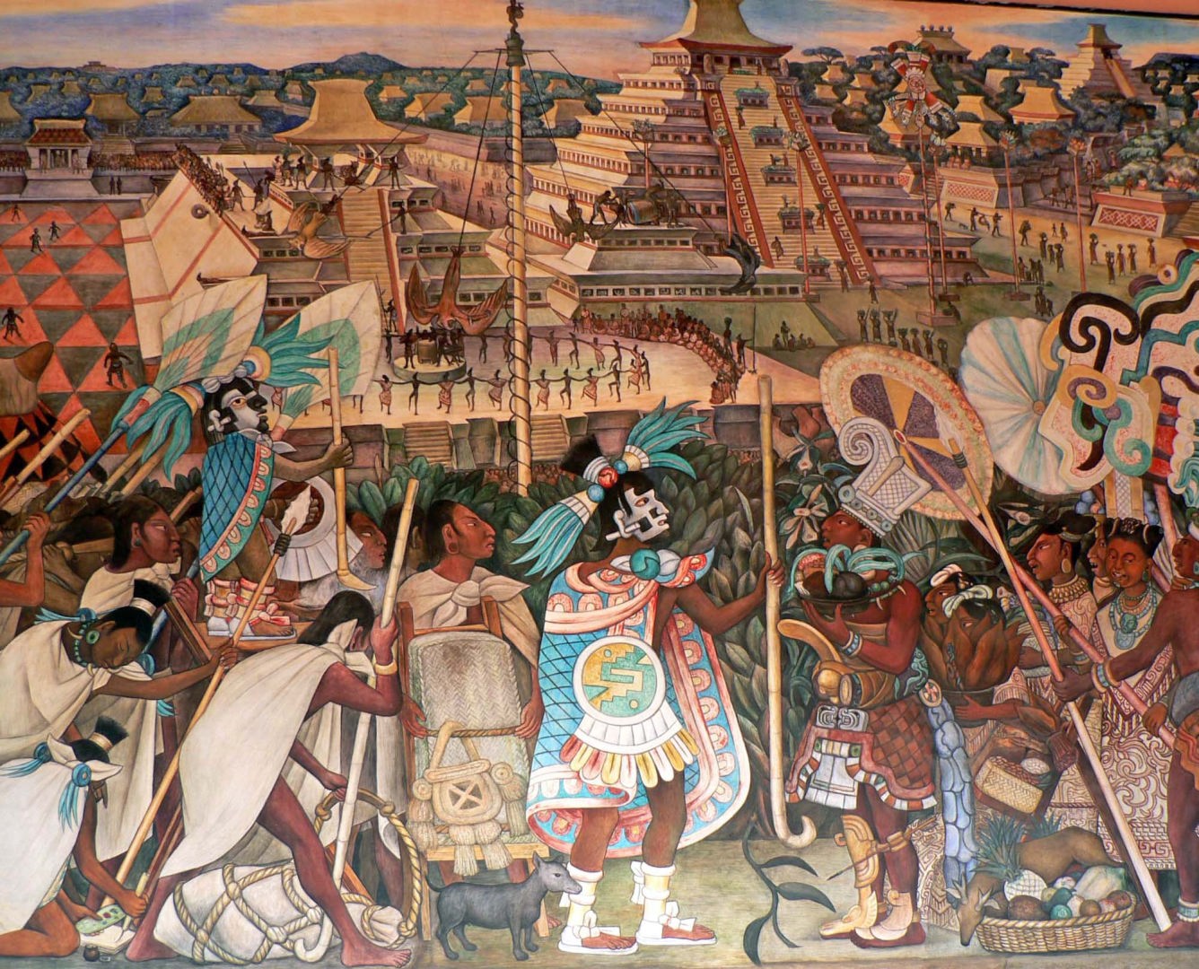 アステカ王国は他の都市に次々と戦争を仕掛け、16世紀初めにはメキシコ湾岸から太平洋側まで広大な都市を支配しました。しかし、1519年、たった500人のスペイン兵がアステカ王国の都に乗り込みました。アステカ九代目の王は彼らを宮殿に向かい入れます。しかし、スペイン人はアステカと敵対する周囲の先住民を味方につけて、1521年、スペインがアステカを征服し、わずか2年でアステカ王国を滅ぼしました。