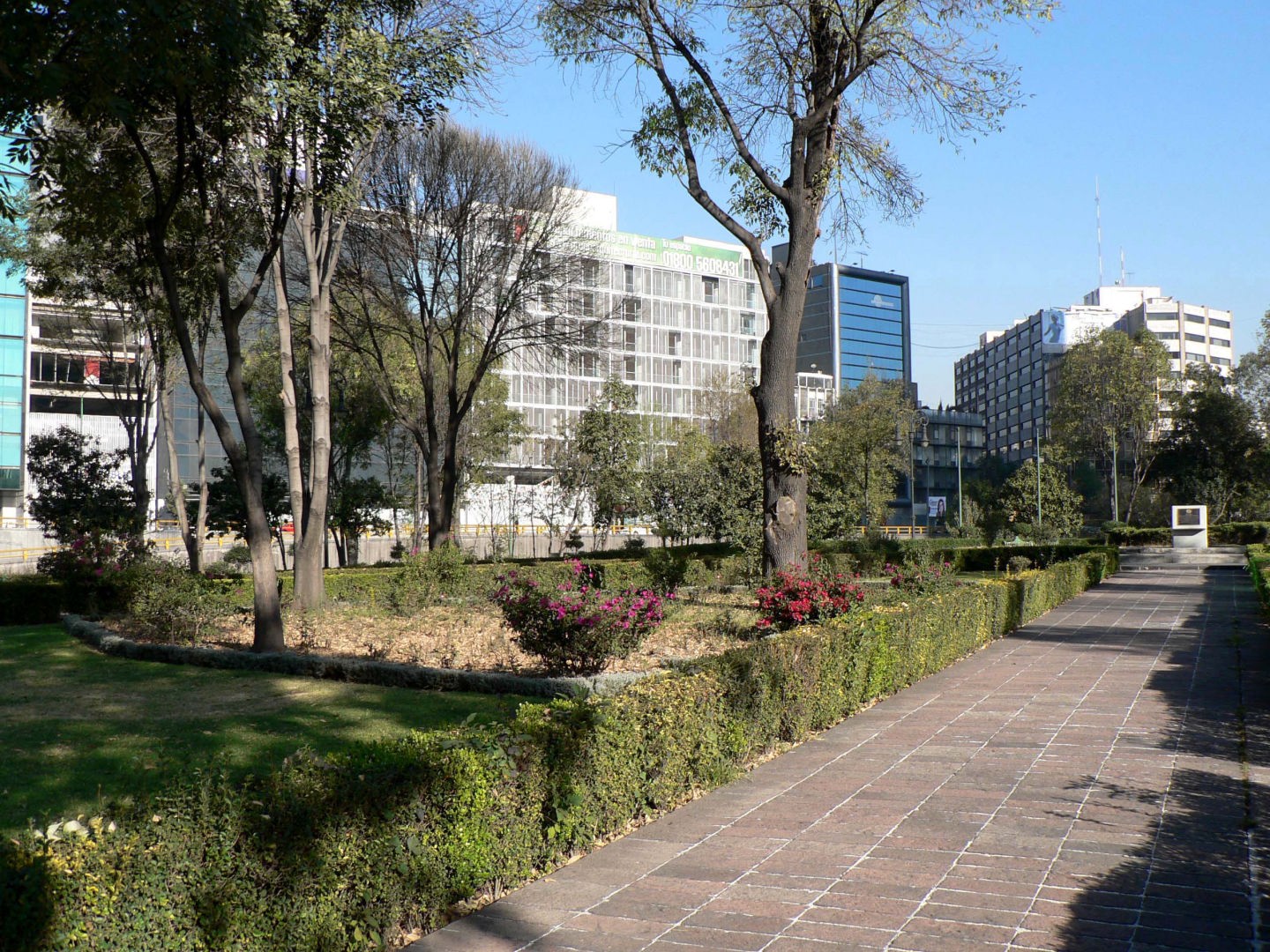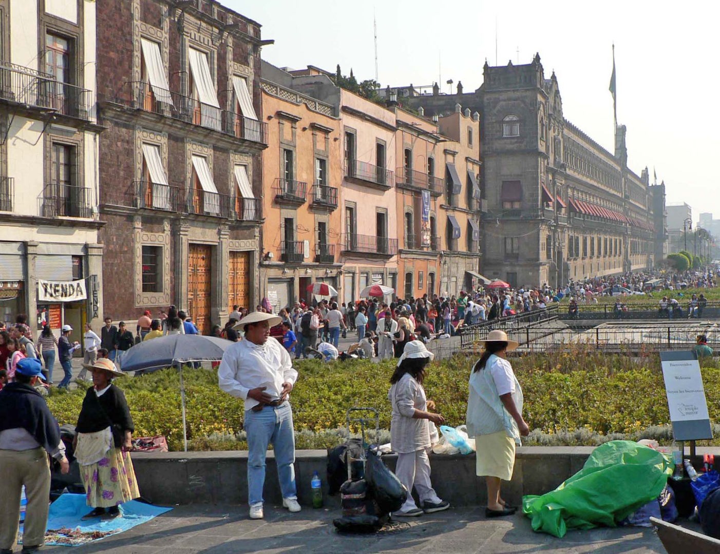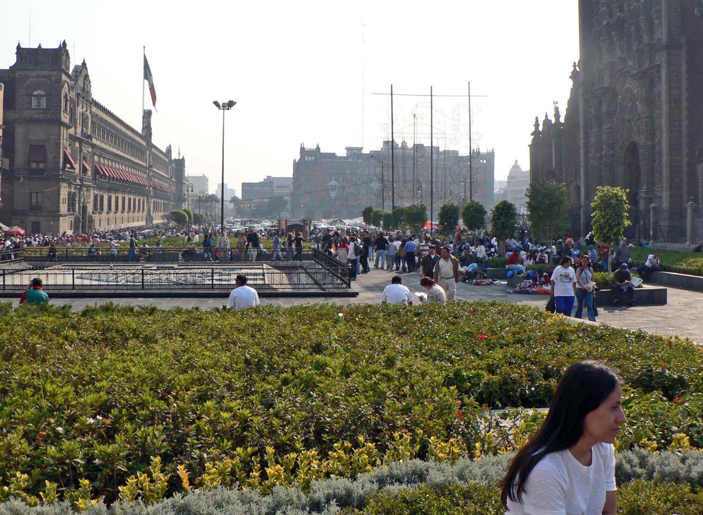 まさにメキシコシティの中央にある広場です。この地は、アステカ帝国時代から神殿に囲まれた重要な場所でした。 16世紀、スペインがアステカ王国を倒したあと、それらの建物を破壊したり埋め立てたりして、代わりにスペイン風の宮殿や大聖堂を建設しました。 この広場は1辺が約150mの四角の広場で、車は入れません。 |