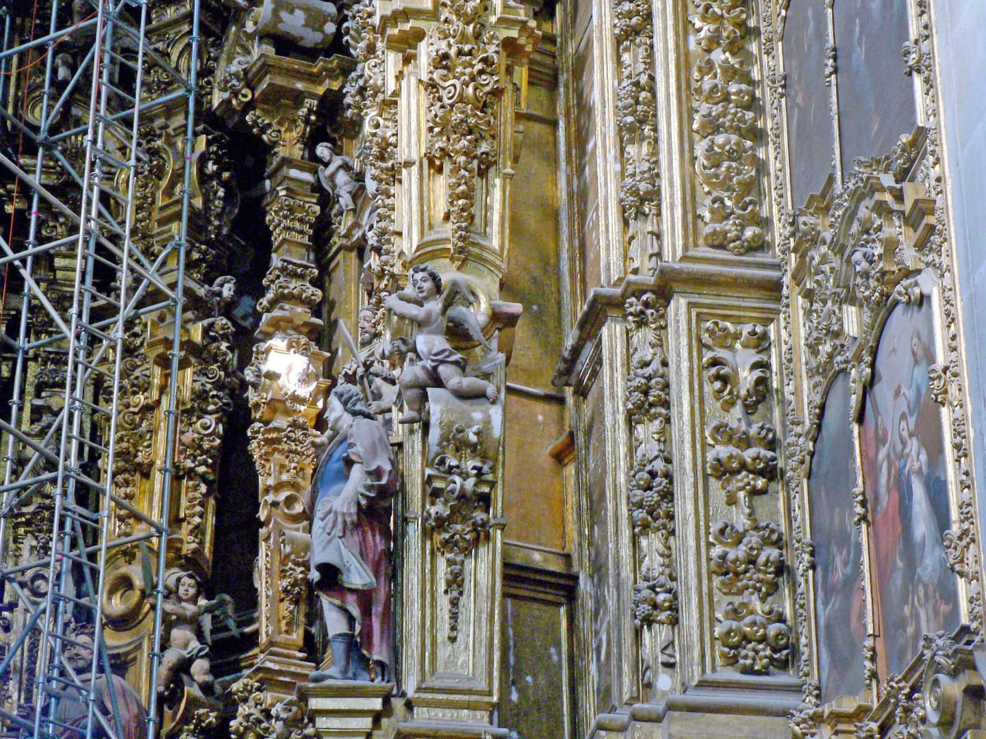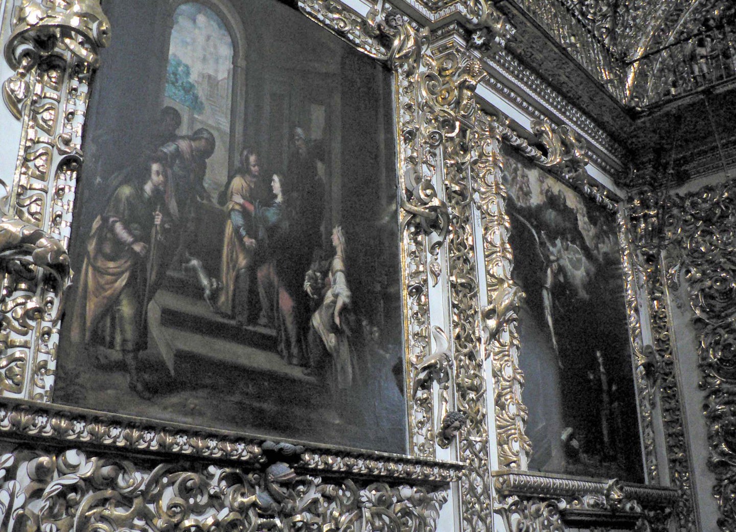 壁面から柱、聖壇まで、すべて精巧な浮彫で装飾されており、それらは金箔で覆われています。また、主聖壇のマリア像が被る黄金の冠には、ありとあらゆる宝石がちりばめられています。荘厳さがかもし出された見事な宗教美術です。