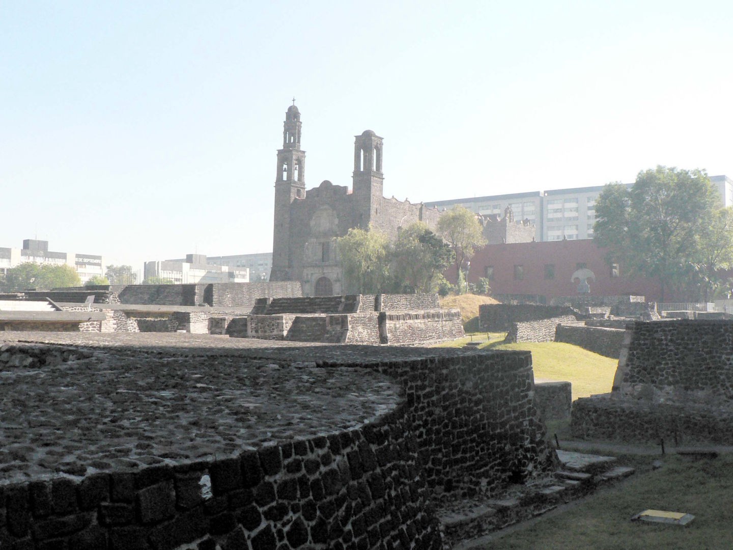 | この広場の周りには、アステカ時代のトラテロルコ遺跡、16世紀建造のサンティアゴ教会、それを囲むように現代的な高層団地が建っているので、三文化広場と名付けられました。 |