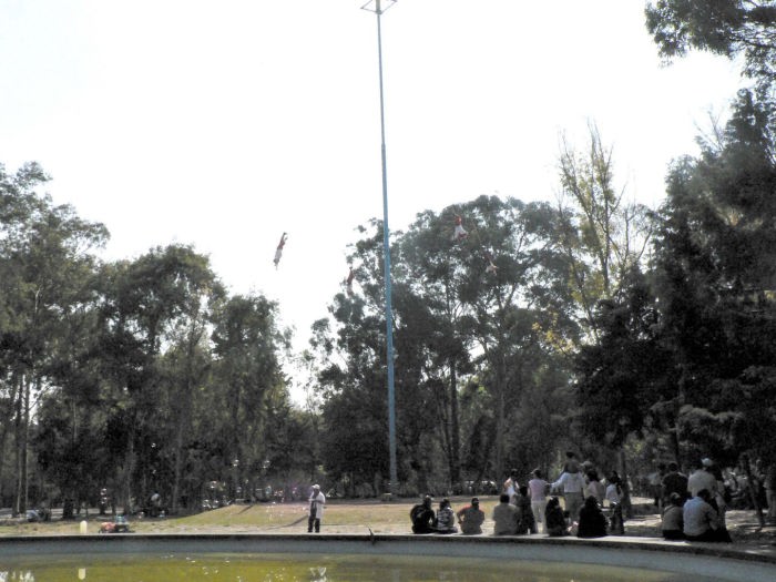 一人は木の先端に立ち命綱も付けず笛と太鼓で踊りを踊っています。4人の男たちはさかさまになってぶら下がり、回りながらだんだんと降りてきます。 |