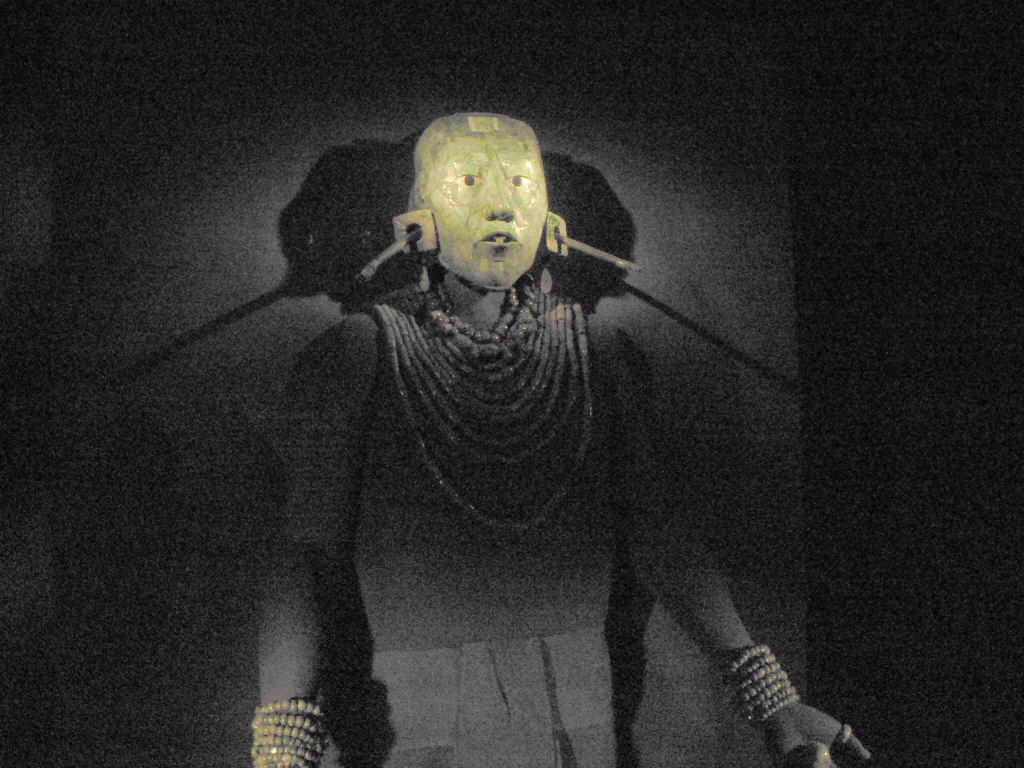 密林に住んでいたマヤ人は、高度の文字と数字を持ち、マヤ人の暦は西洋の暦よりもはるかに正確でした。例えば1年の日数を365.242日であることを知っており、西洋人の日数 365.25日よりも正確でした。 これはパレンケの碑文の神殿から発見されたパカル王のヒスイの仮面です。 パレンケの神殿は地下に墓を作り、王様のお墓がつくられています。 博物館の中には、実物大の模型が作られ、数々の遺物が飾られています。 |