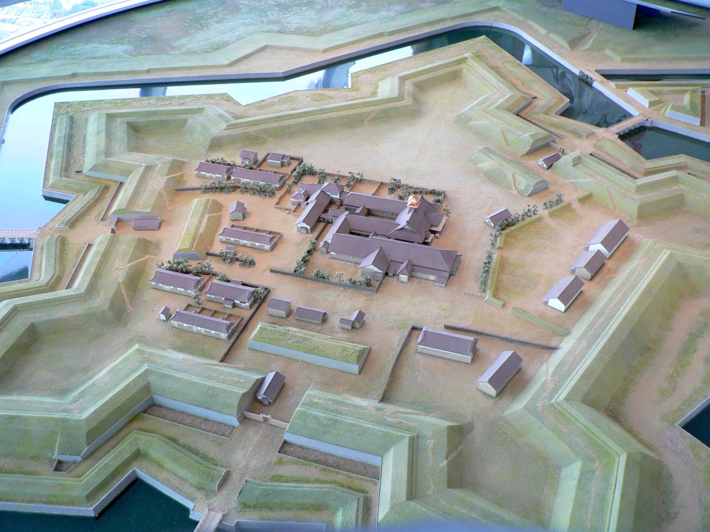五稜郭は徳川幕府により1857年から7年かけてつくられた5角形の星形をした城で、星の角からは敵に十字砲火を浴びせることが出来、また、死角が少ないという利点があり、蘭学者の武田斐三郎(あやさぶろう)がヨーロッパの城をモデルにつくった洋式城郭です。