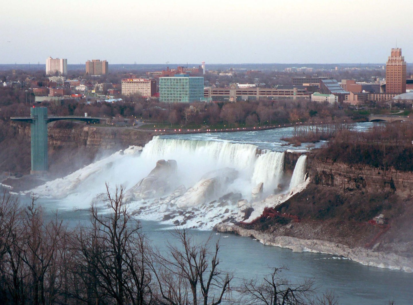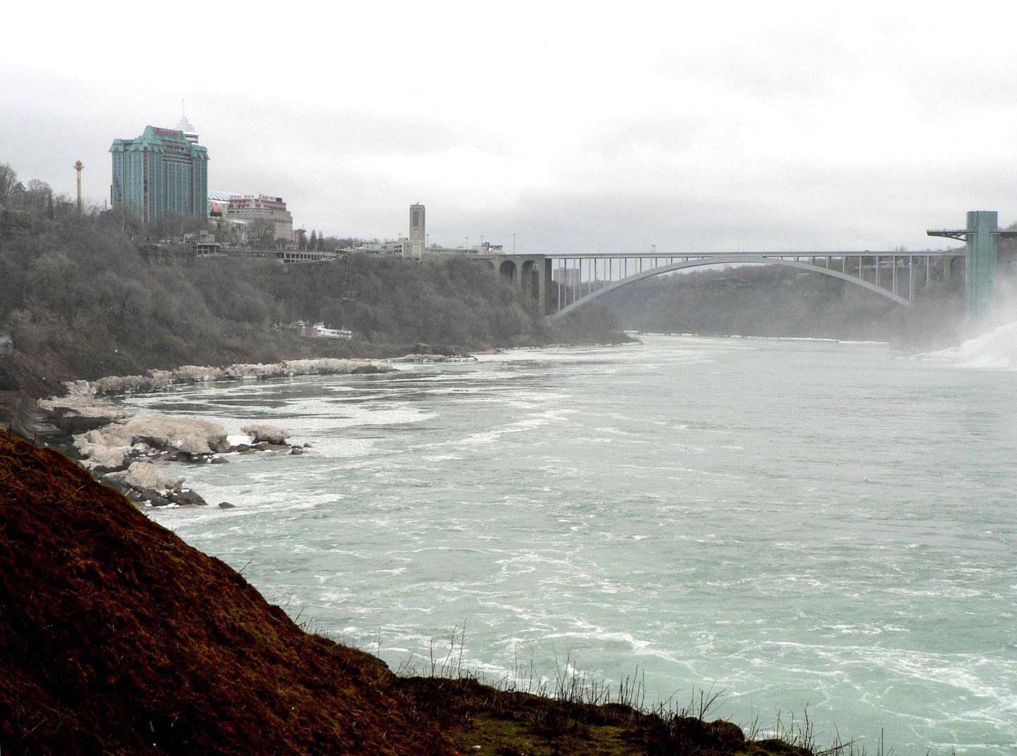 ナイアガラの緯度は札幌と同じですが、たくさんの氷がまだ流れており、虹の乙女号はまだ出ておりませんでした。滝にも氷が残っていました。 |