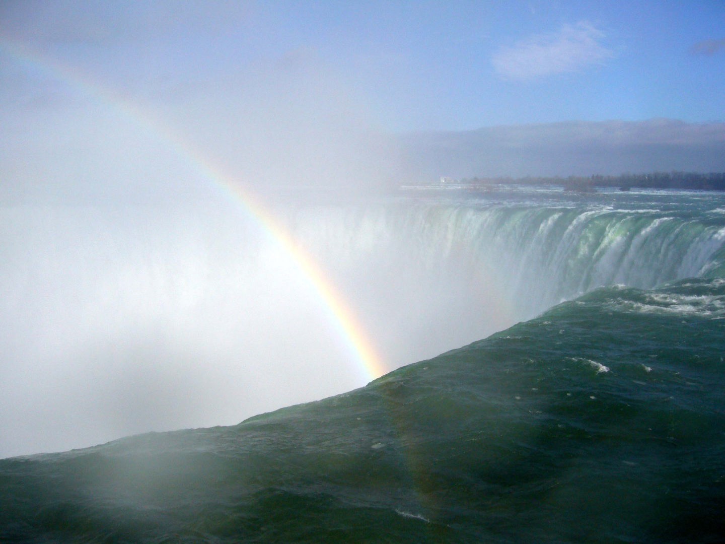 | 午前中は曇り模様で、虹を見られませんでしたが、午後は快晴になり、何時までも消えない虹を堪能することが出来ました。ただし、水しぶきが強いので、濡れる覚悟が必要でした。 |