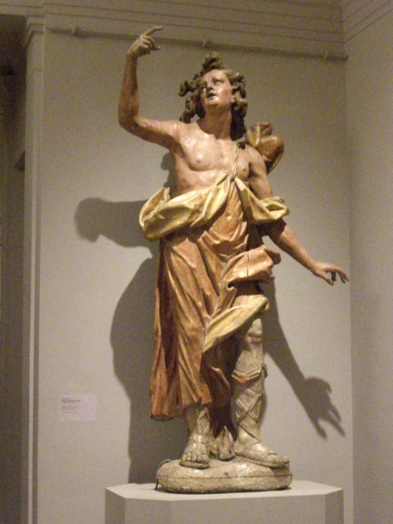 後ろには磔のキリストが描かれています。 |