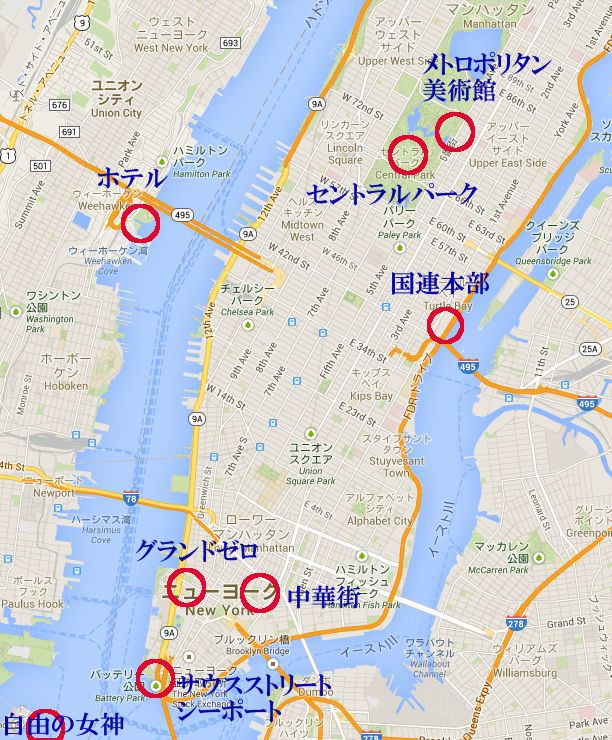 市内観光はテロで崩壊したグランドゼロ、国連ビル、サウスストリート・シーポート、ロックフェラーセンター、セントラルパークなどで、ホテルはニューヨーク市の対岸のニュージャー州側でした。 |