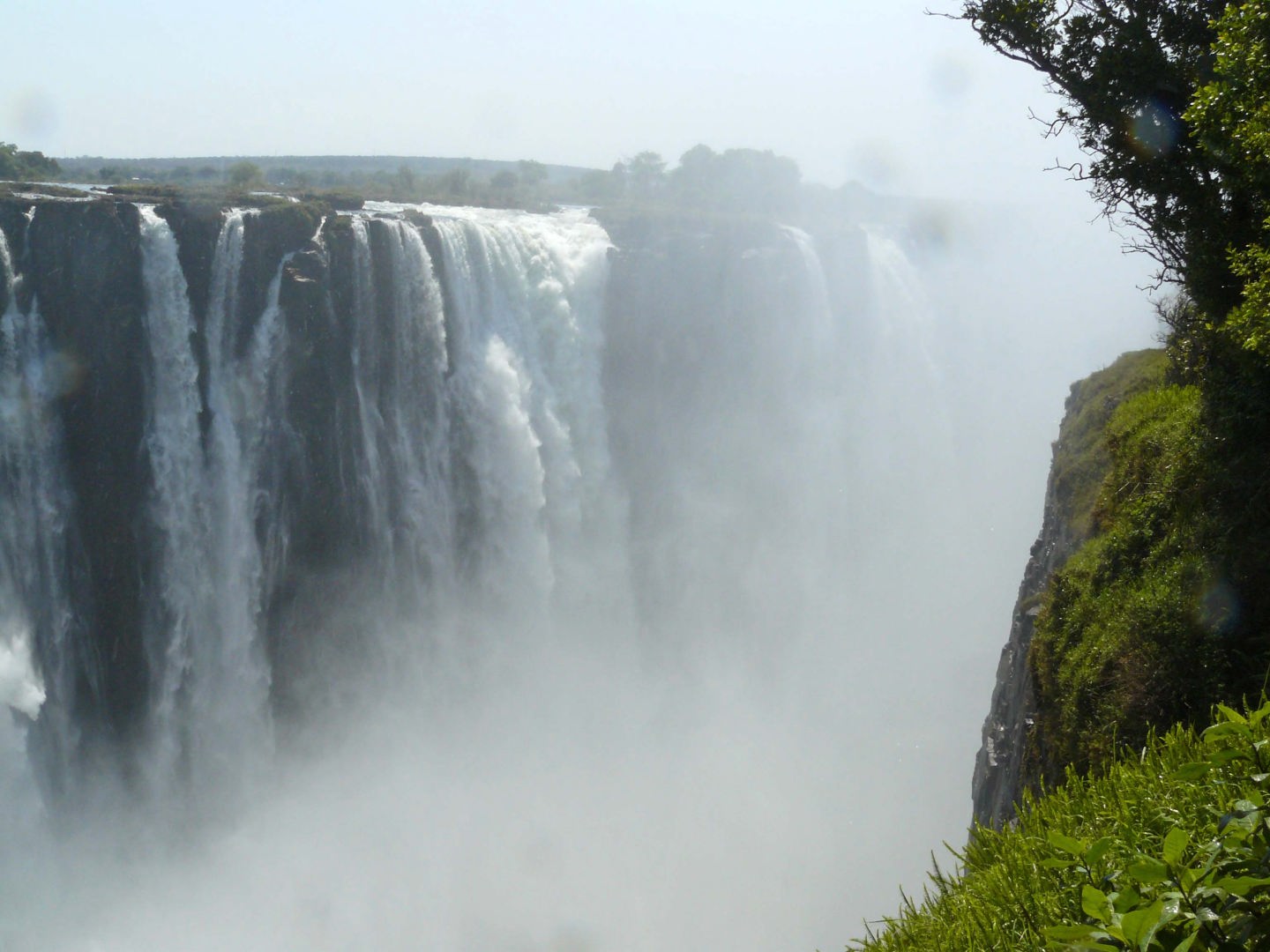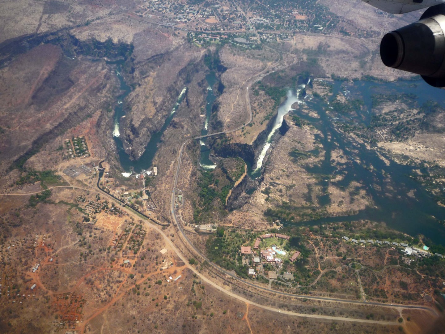 リビングストーン空港に着陸する直前、眼下にビクトリアの滝が現れました。初めて見る滝ですが、滝からは水煙が立ち上がっていて、あれがビクトリアの滝だということはすぐにわかりました。滝つぼからのうねりくねった川の様子も写真を見ているようによくわかりす。それから少し飛ぶと今度はたくさんのバウバブの木が、砂漠のような大地に根を張っています。いよいよ今回の旅の出発点に到着です。 |