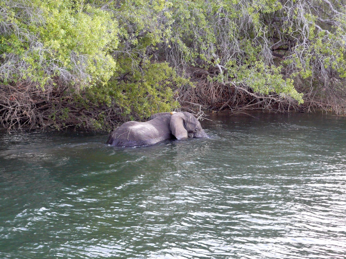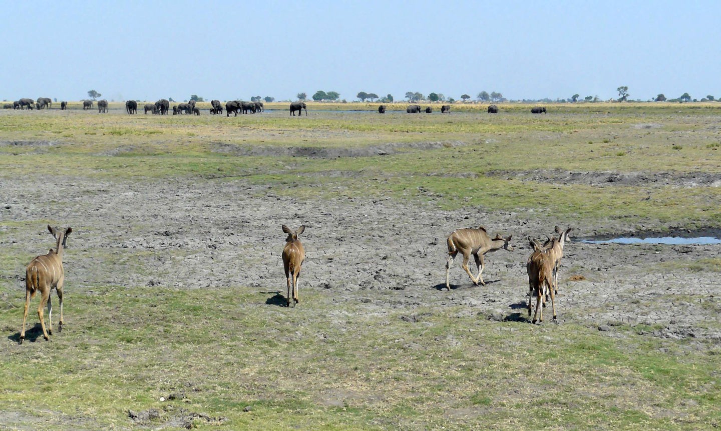 川の中州には、ゾウやカバ、クードゥー、セーブルアンテロープなどいろいろな動物が、一生懸命草を食べていました。今は乾季なので、この中州も姿を現していますが、雨期になると川になってしまうそうです。 |