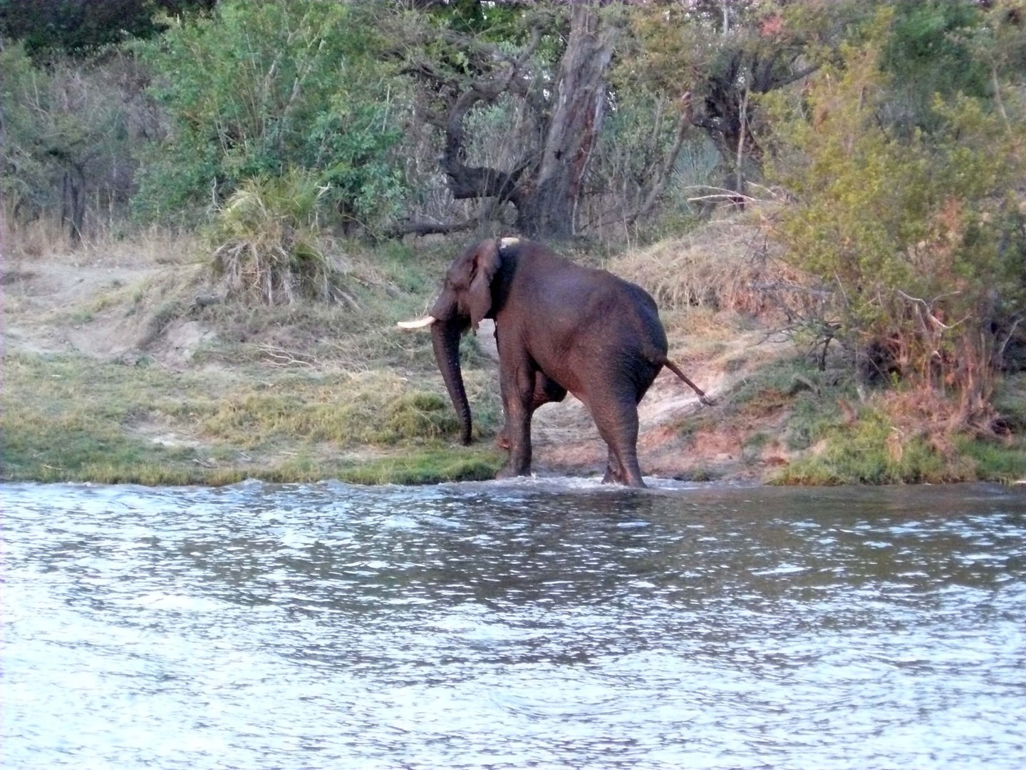 | 突然、象が現れました。しばらくして、象が広い川を渡りだしました。何度も渡っているのでしょう。ゆっくりと鼻を上にあげ渡ってゆきます。けもの道というのでしょうか、上陸したところは、踏み固められており、歩く道は決まっているようでした。 |