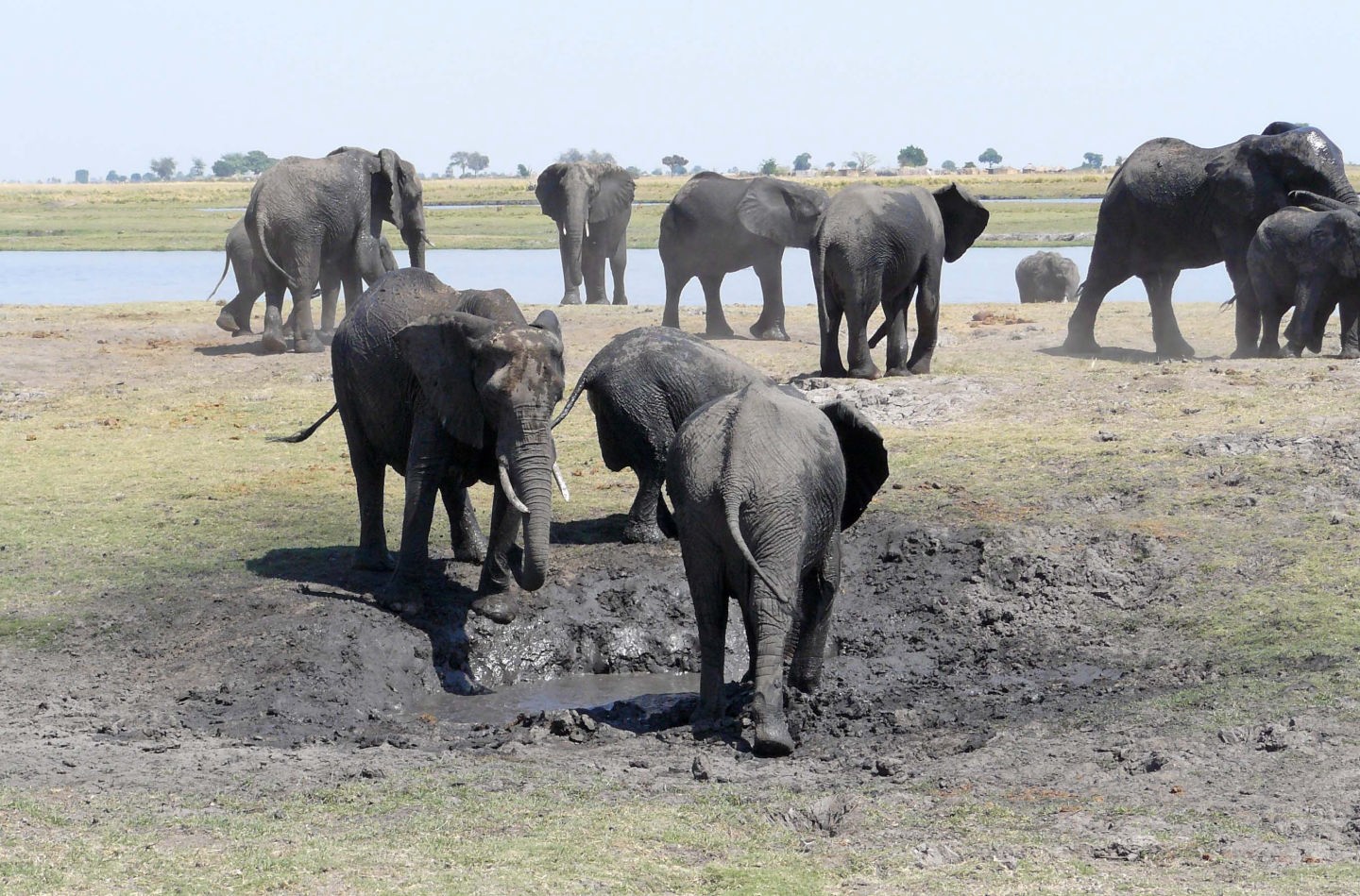ゾウの群れが小さな泥沼にかわるがわる入っては体に泥を塗りつけていました。時々、乾いた土も鼻で吸い込み、その上に降り注いでいました。 |
