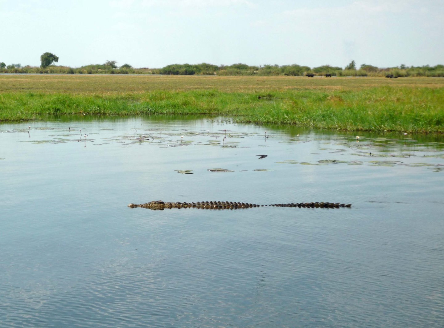 船は動物を探しながらいろいろな方向に進みますが、このチョベ川は川というよりは沼のようで、水の流れはほとんどありません。ただ、万一、船から落ちると、ワニやカバがたくさんいるので、救命胴衣などを着けていてもあまり意味が無いそうです。
