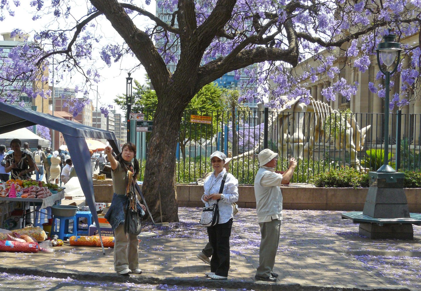 街はまさにジャカランダの花で埋め尽くされていました。この花は100年前にブラジルから持ち込まれ、現在、プレトリアには7万本を超えるジャカランダの木があるそうです。 |