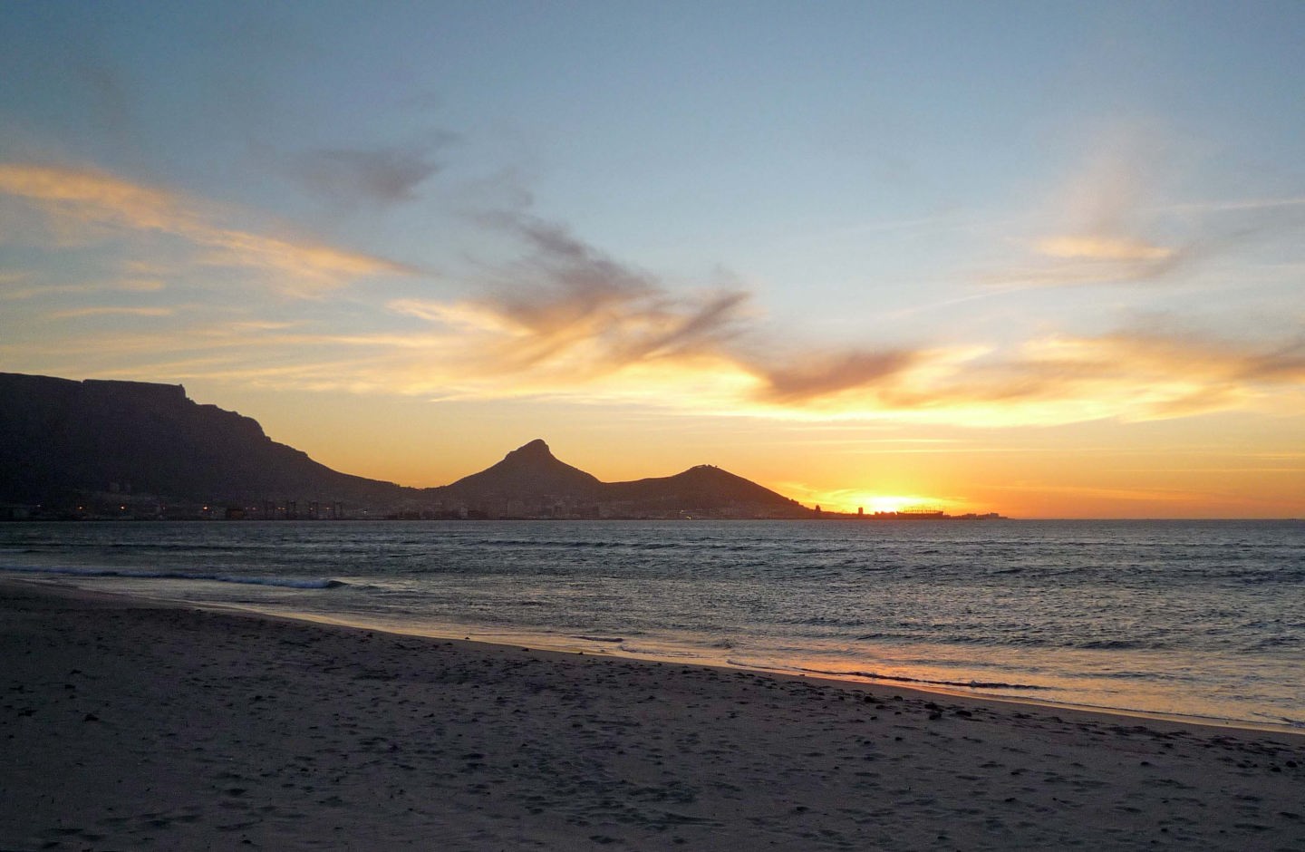 | ケープタウンの町はテーブルマウンテンのすぐ下にあります。確かにテーブルのような山が見えます。夕日に建築中のサッカー場が浮き上がって見えました。 |