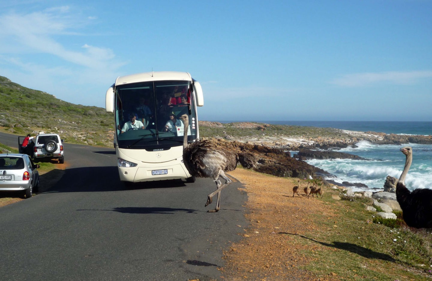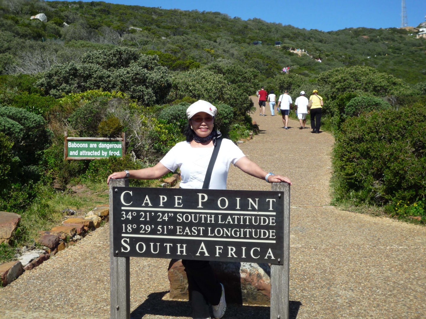 | 喜望峰で記念写真を撮りました。海岸から遠く離れた所にも白波が立っていました。この地域は海流が荒く、風も強く、多くの遭難船を出したそうです。歌劇「さまよえるオランダ人」もこの地をテーマにしているそうです。 |