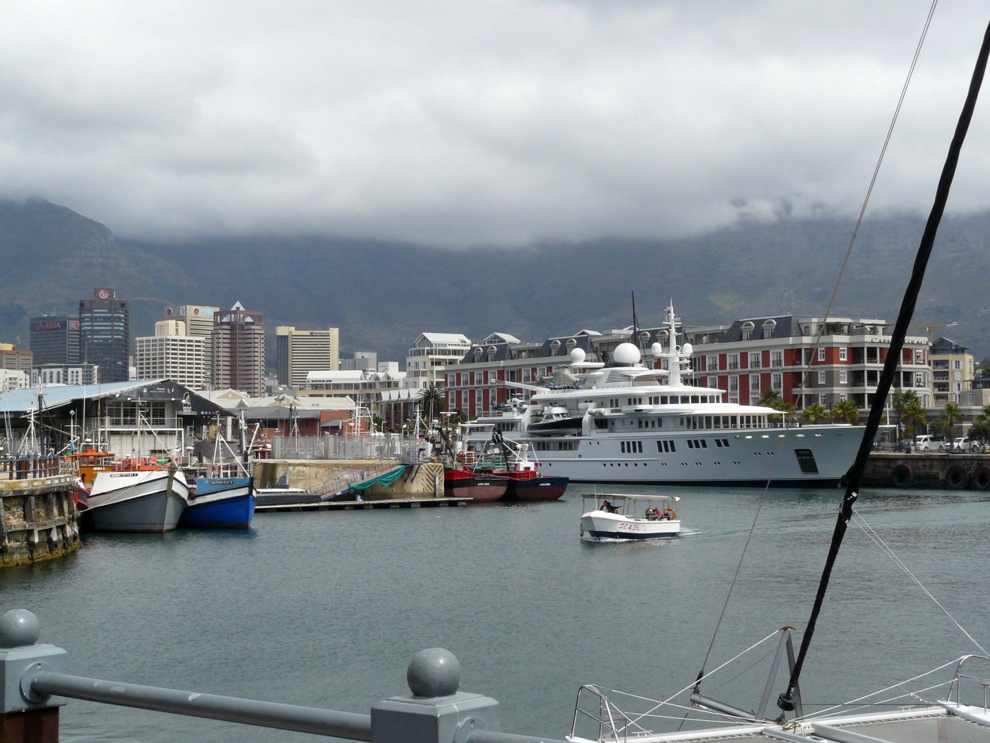 幸い今日も晴天でした。テーブルマウンテンがはっきりと見えます。ケーブルカーで昇りますが、ケーブルは平らな山の最右端から下に伸びています。
