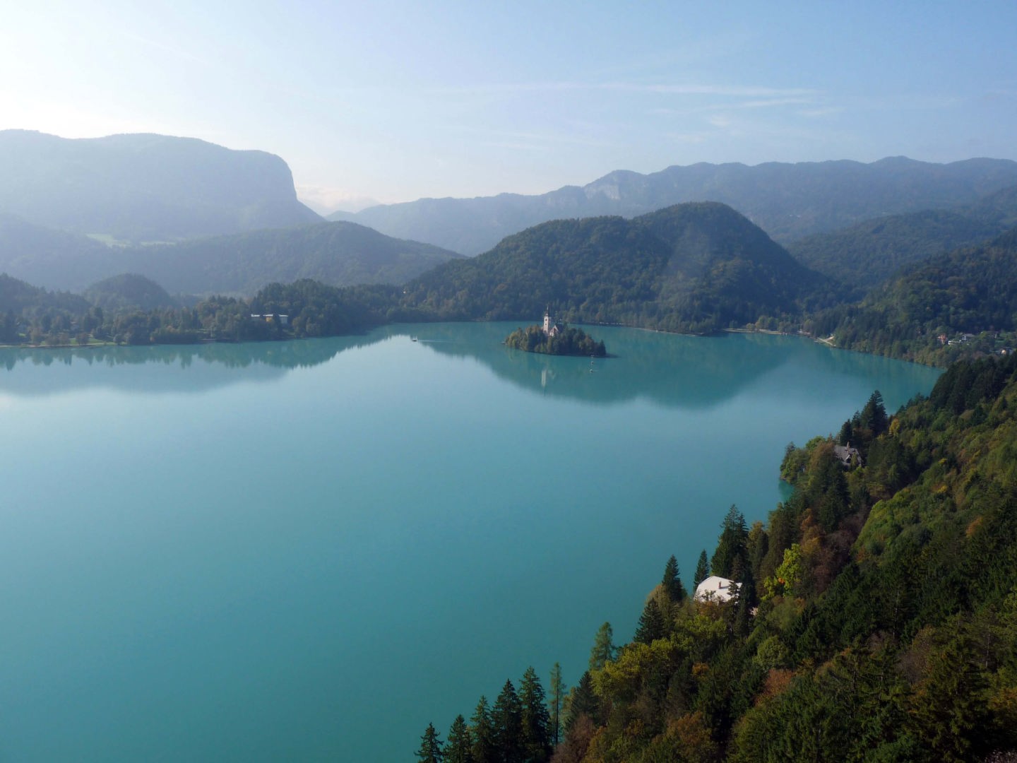 エメラルドのように美しい湖面に聖マリア教会が浮かび上がって見えます。また、湖の向うの岸壁の上にブレッド城が建っています。アルプスの瞳と言われるのも納得でした。 |