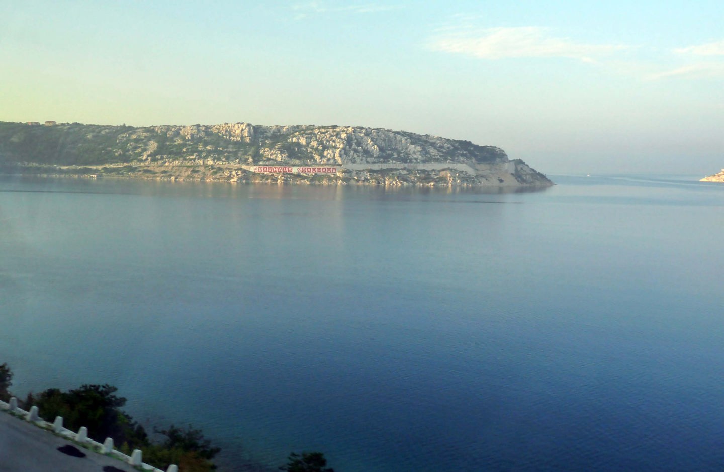 アドリア海のクロアチア領には1千もの島々が点在しています。いずれも石灰岩がむき出しの痩せた島のようでした。幸い今日も晴天で、アドリア海は驚くほど凪いで居ました。 |