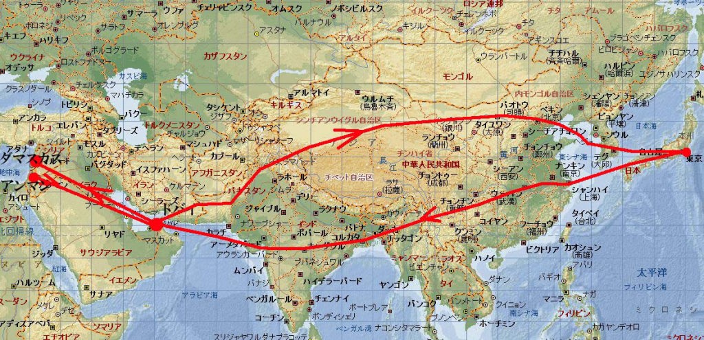 下の図は、今回訪問するドバイ首長国の首都ドバイ、シリアの首都ダマスカス、ヨルダンの首都アンマンです。 |