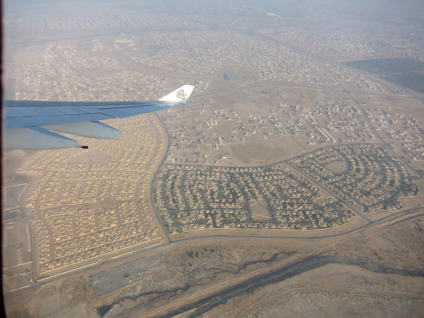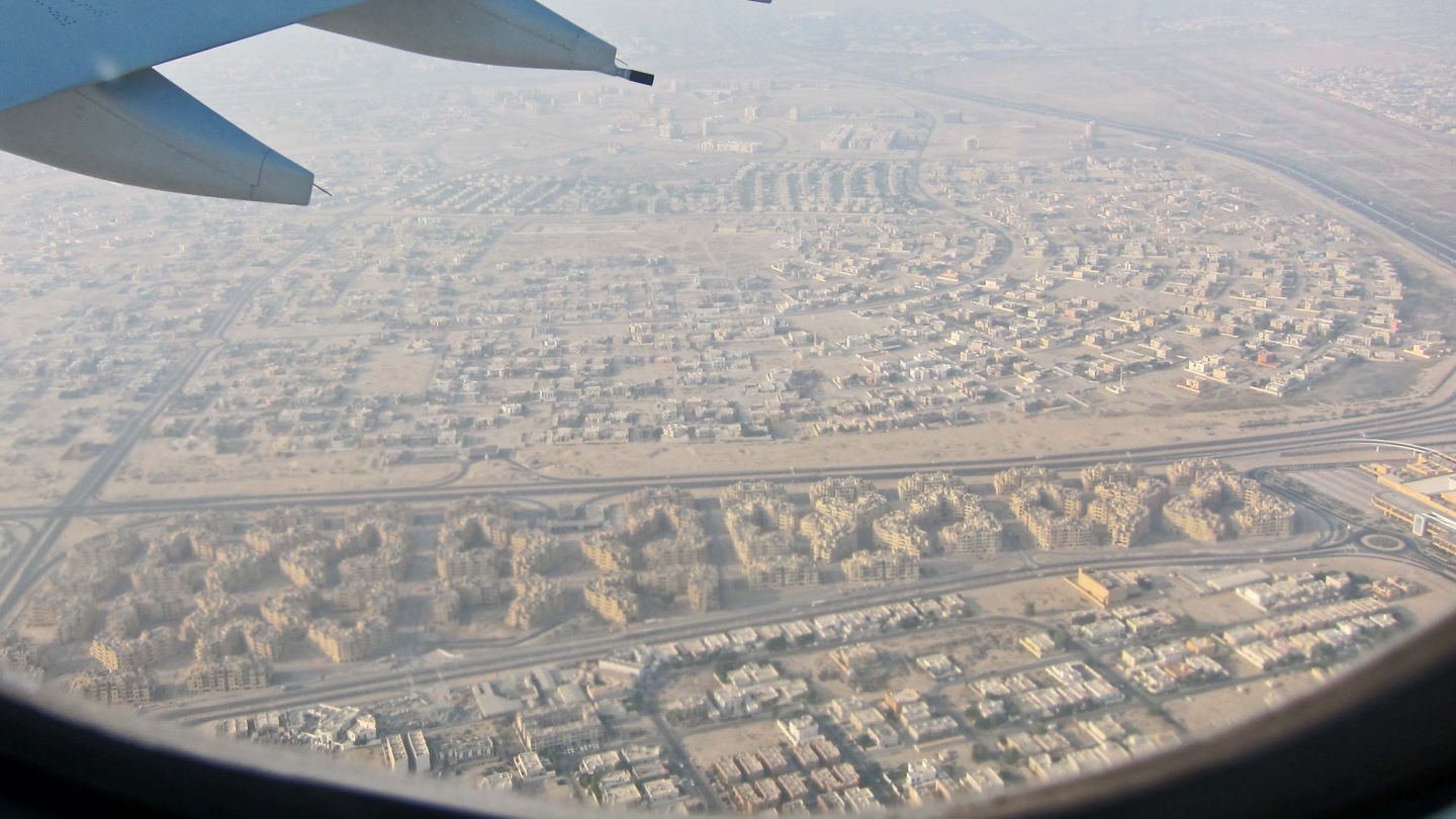 | 砂漠の上を飛んできた飛行機は、ようやく民家のある町に近付き、ダマスカス国際空港に着陸です。樹木もところどころに見え、地下には水があるようです。 |