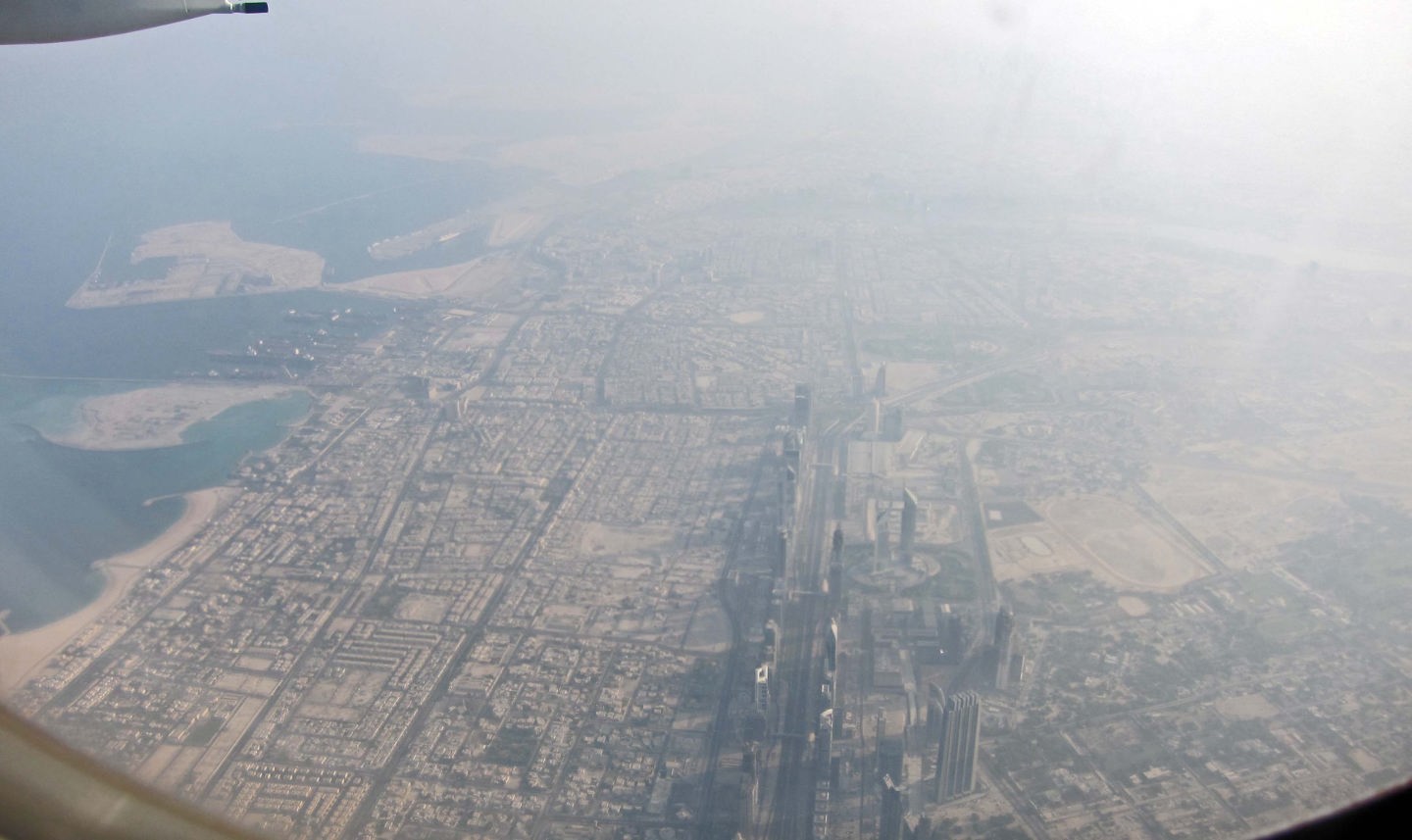 | 飛行機は少し小型になり、座席は2−4−2の並びなので、窓側を取りました。ドバイはこの10年で急速に発展し、たくさんの高層ビルが建設されていますが、窓からはその広さを実感できました。 |