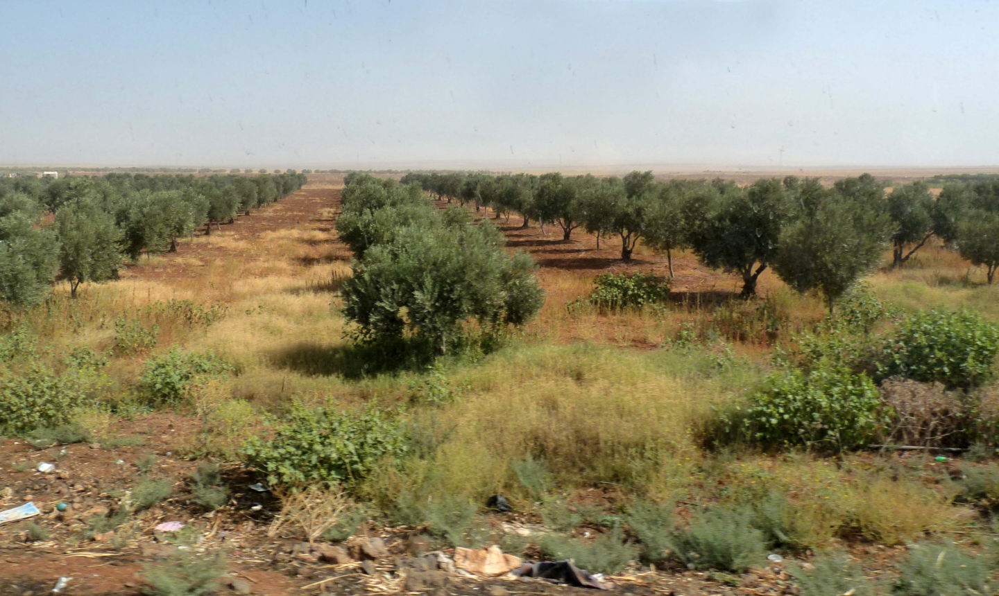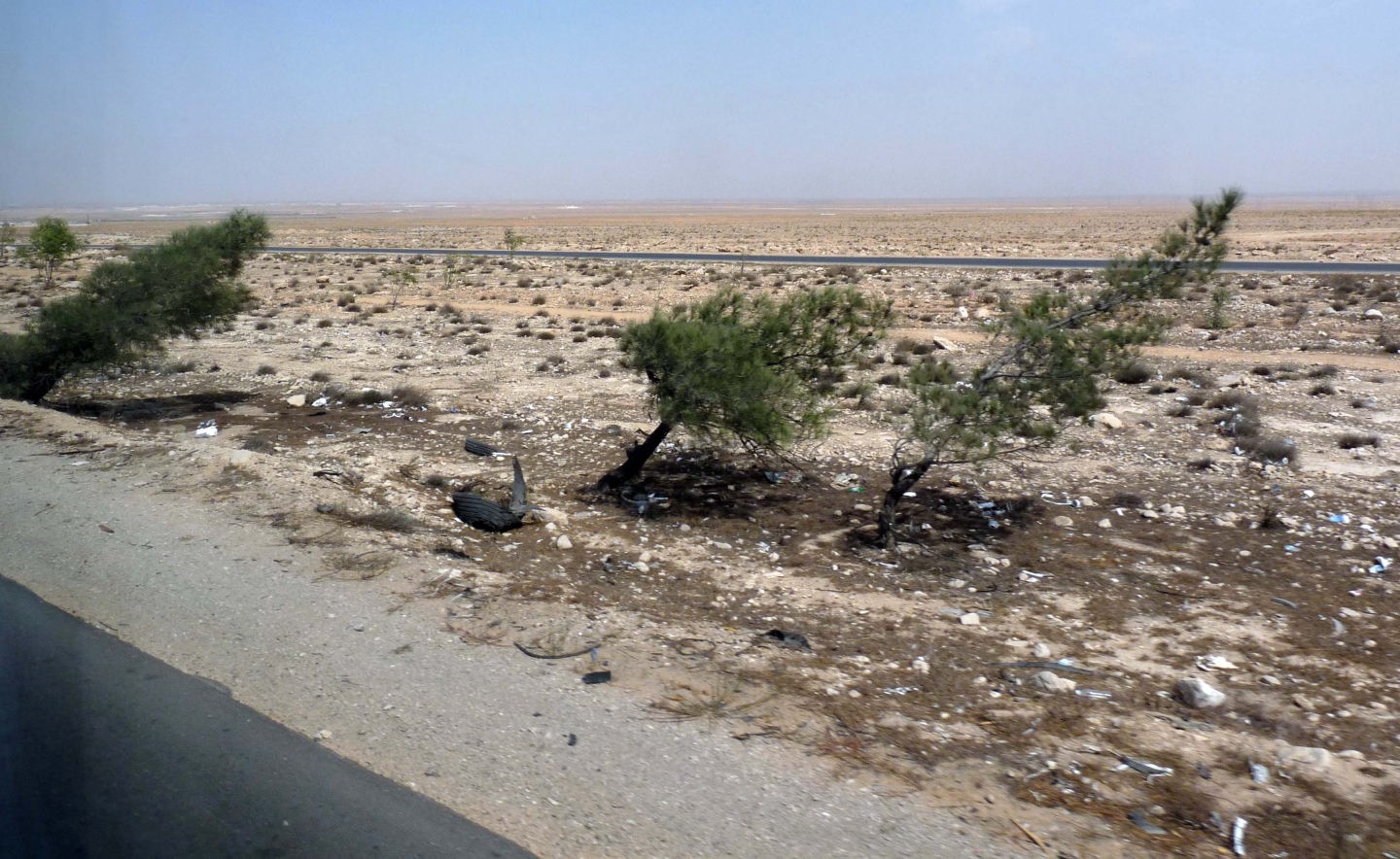 | バスは再び砂漠の中を北上し、12世紀に作られた十字軍のお城、クラック・デ・シュバリエに向かいます。砂漠に吹く風はかなり強いのでしょうか、樹木が傾いています。砂嵐になると、前が見えなくなるそうです。道路の両側は、ここもゴミが放置されていました。 |