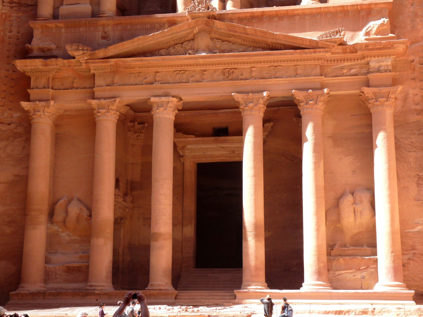 山の頂に到着するとエド・ディル修道院が姿を現しました。この修道院は、幅50m、高さ40mあり、エル・カズネよりも大きくなっています。ナバテア人が1世紀のころに造った神殿で、2階の塔の頂部には3本の縦の棒と円の模様の繰り返しがあります。これをナバテア様式というのだそうです。