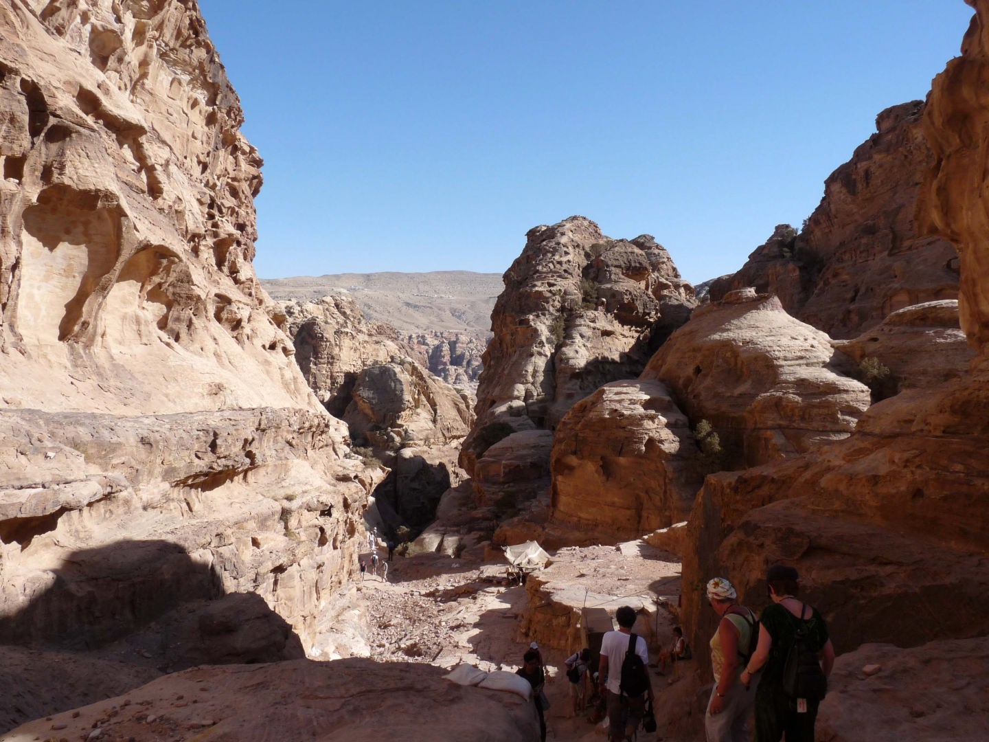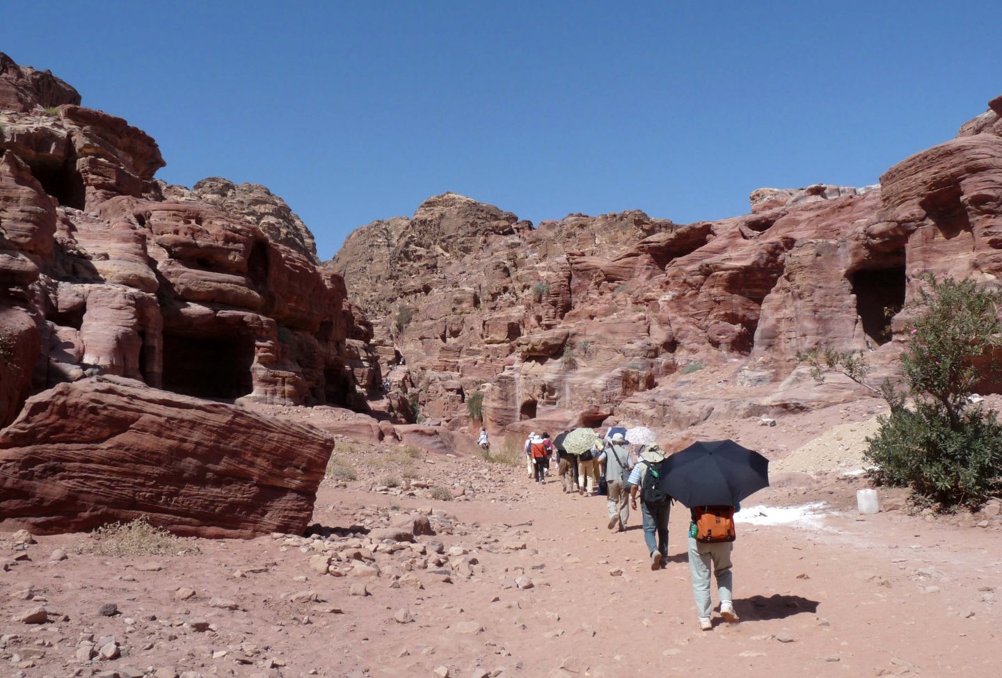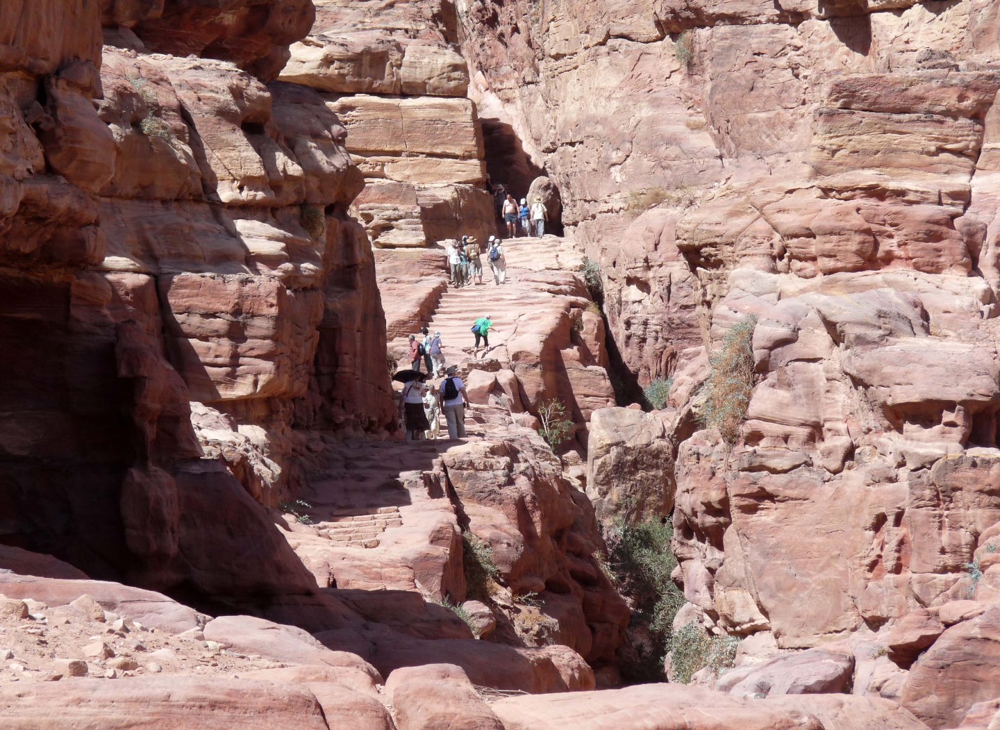 遺跡のほぼ奥にある博物館近くのレストランで昼食を取り、午後は各自、自由行動です。足の悪い人は、この近くから馬に乗ったりして帰ることも出来ます。私たちはここから階段が約900段もあると言われる、ナバタイ人の神殿、エド・ディルまで行くことにしました。階段の無いところは緩やかな登りになっており、エド・ディルまで通常の足で1時間ほどかかりるそうです。添乗員さんは一番足の遅い人の後ろになって、一緒に登って来ました。