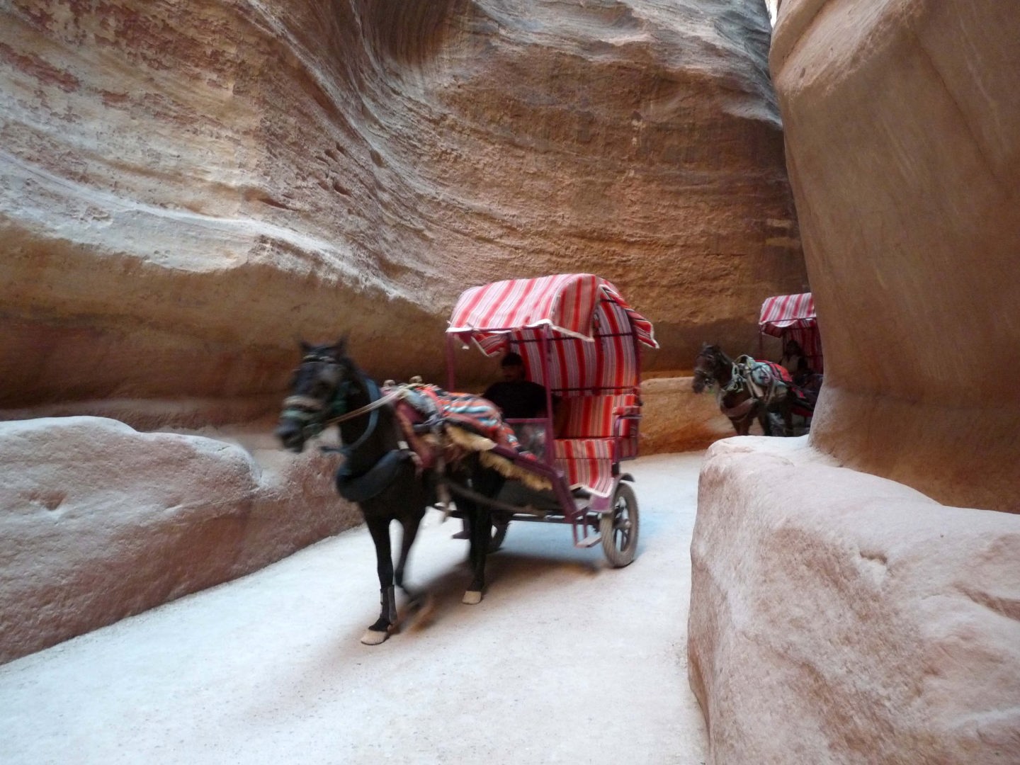 足の弱い人はロバに乗って行くこともできますが、ロバもろとも崖から落ちる事故がけっこうあり、添乗員さんからは絶対に乗らないで下さいと注意を受けました。道を登っていると、ロバがかなりのスピードで岩道を下りて来ます。仮にこちらがぼんやりしていると、ロバと正面衝突してしまいます。道路の端によって、ロバが通り抜けるのを待つしかありません。 |