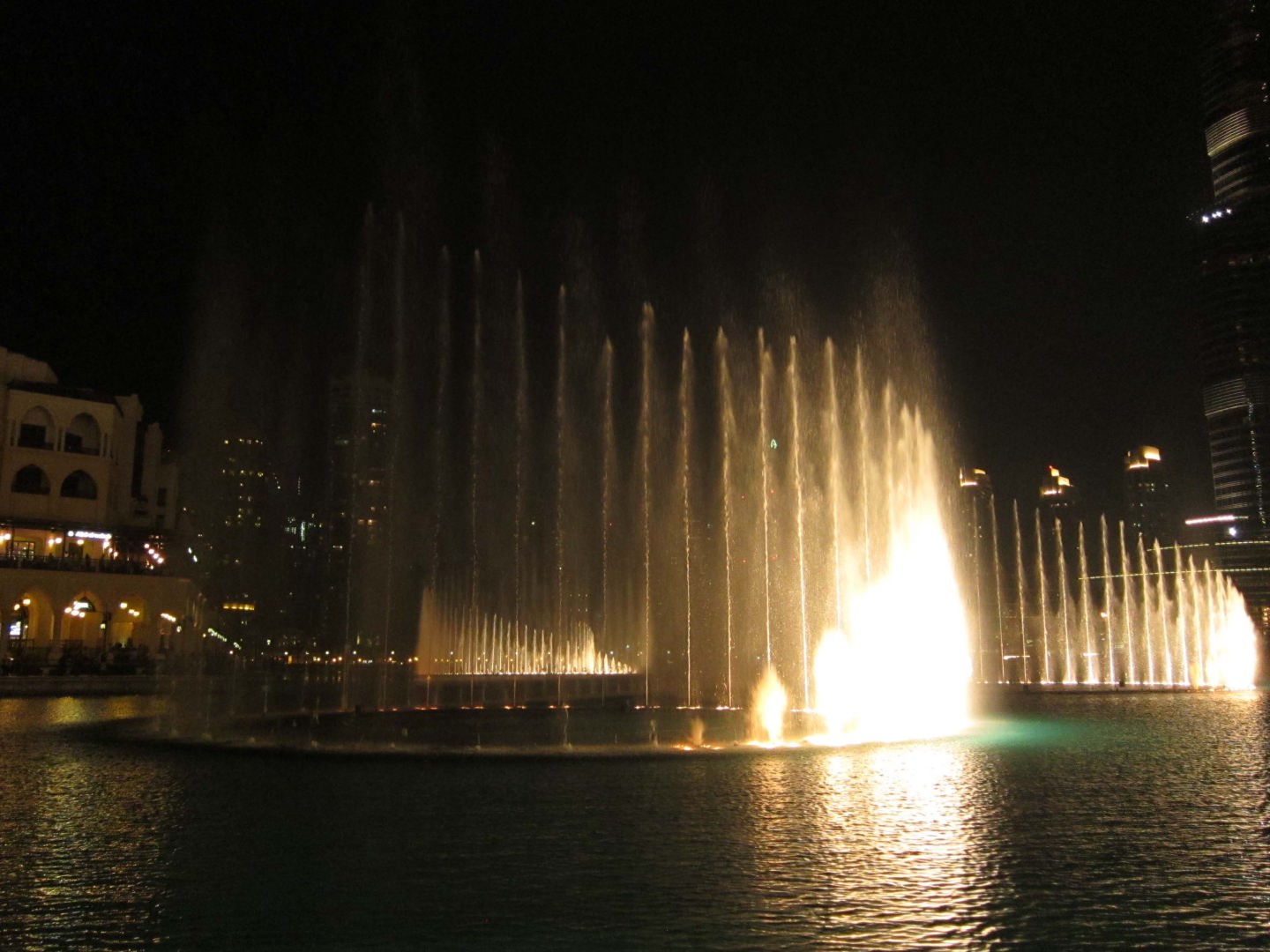 | ドバイモールの前にある世界一大きな噴水です。ドバイはなんでも世界一を目指しています。この噴水ショーは30分おきに行われます。音楽とともに噴水が吹きあがります。 |