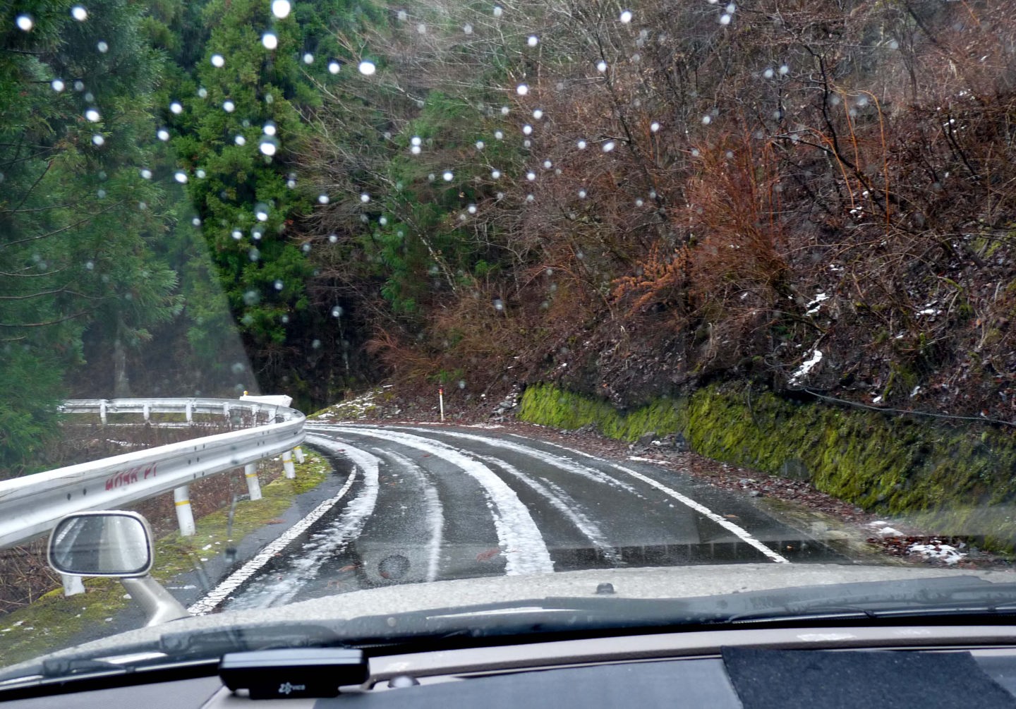 カーナビに目的地を入力し、それを信じてドライブしてゆくと、道路はすれ違いも不可能な細い道に入り、山道をどんどんと上がって行きます。どうも剣山スキー場に向かっているようです。道路は国道483号です。山頂近くになると雪が積もっていました。まだ冬タイヤを履いていないのでかなり危険です。勇気を出して戻るべきか、このまま進むべきか迷います。Uターンすれば、かなり遠回りにはなりますが、安全に今夜の宿には行くことが出来ます。しかし、もう、山道を2時間近くも走っています。かなり疲れており、この狭い道をいまさら戻るのも辛いものがあります。ただし、まだ、車1台にも出会っていません。向こうから来る車がないのは、通行不可能なのかもしれません。しかし道路はあまりにも狭く、Uターンの出来るところはなかなかありません。とりあえず、注意しながら登って行くと、山頂近くの夫婦池に到着しました。ここからはずっと下りになります。なんとか無事に山道を通過できそうでした。