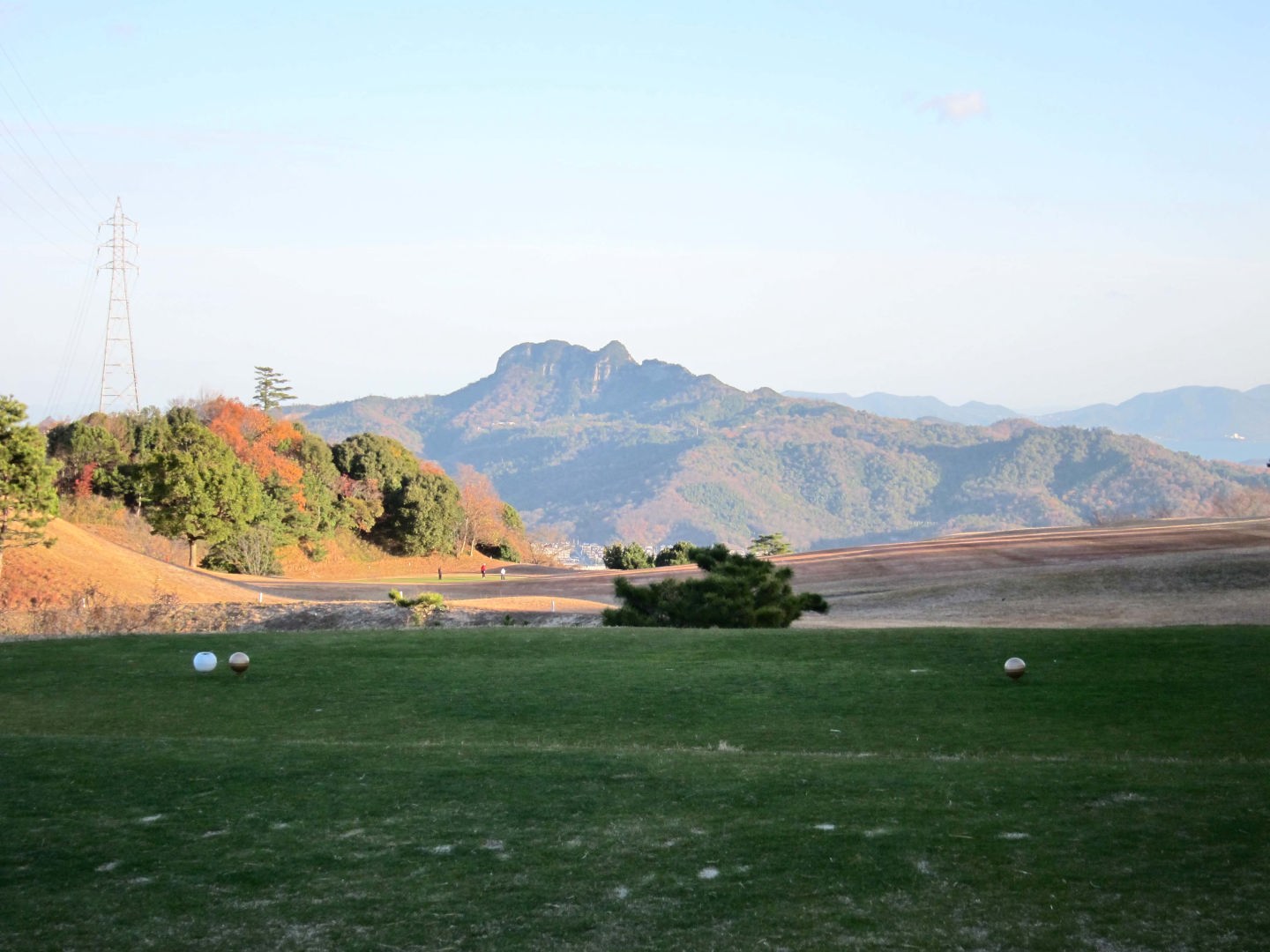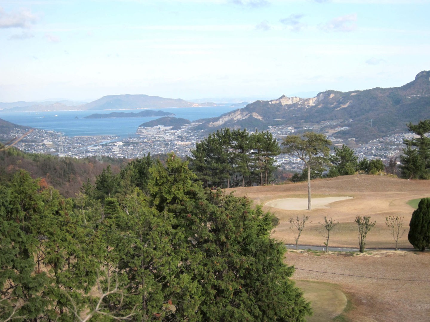 瀬戸内海を見降ろせる景観の素晴らしいゴルフ場です。山の上に作られ、遠くに屋島が見えます。