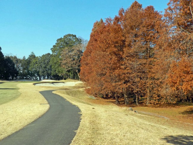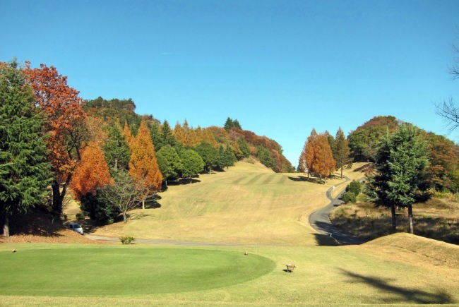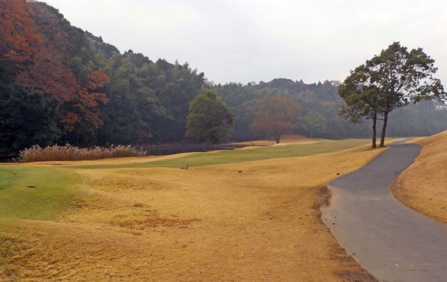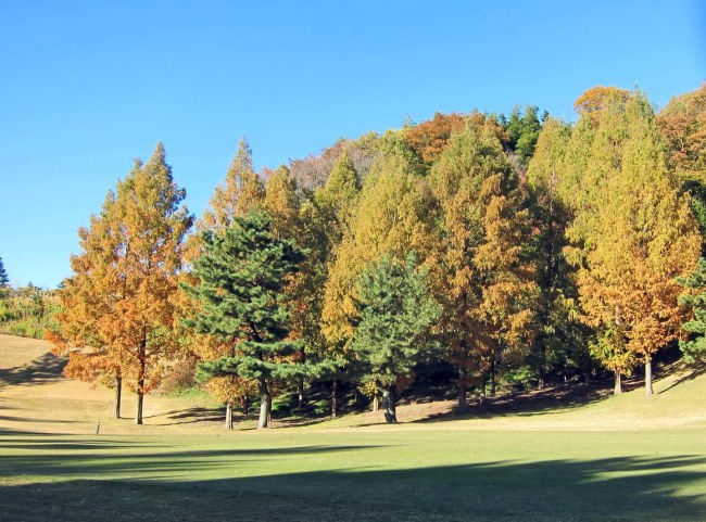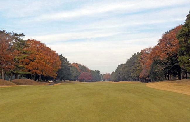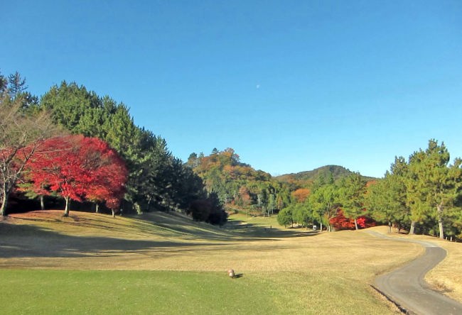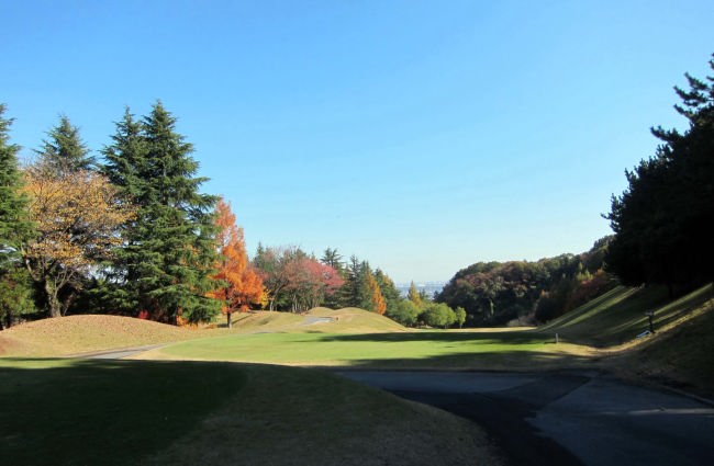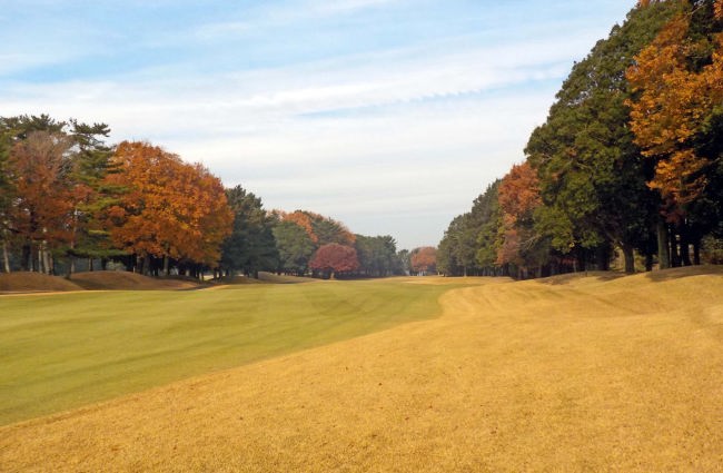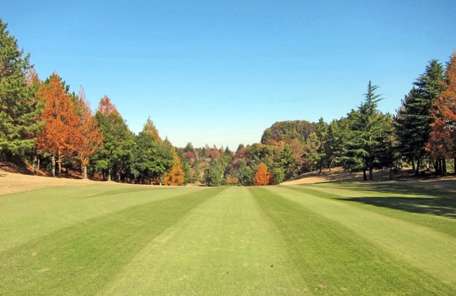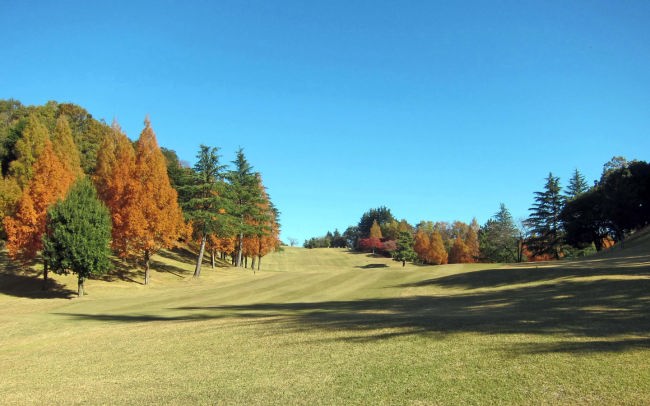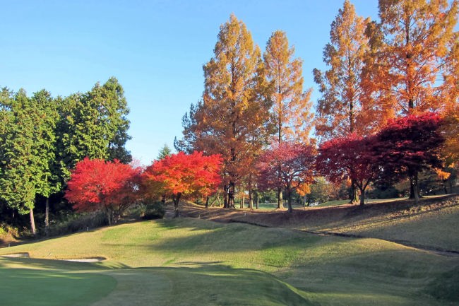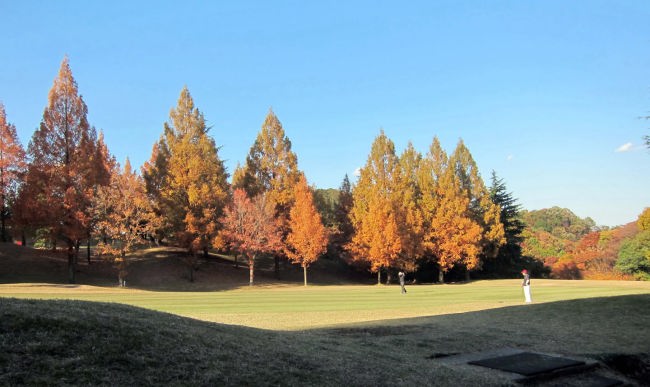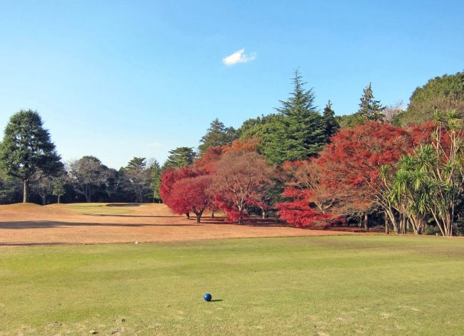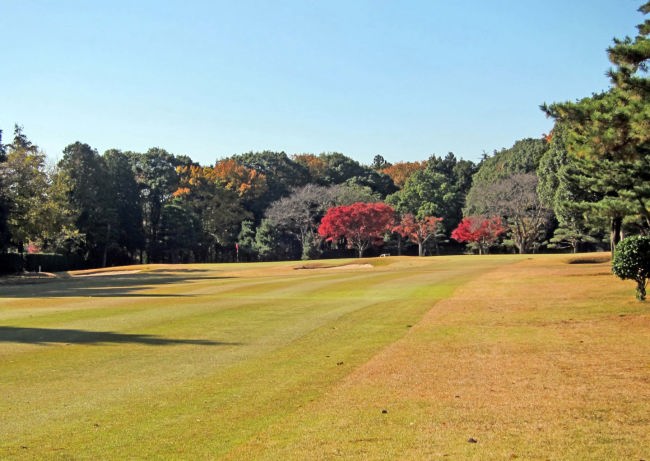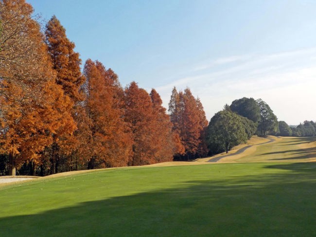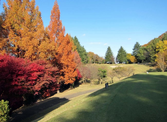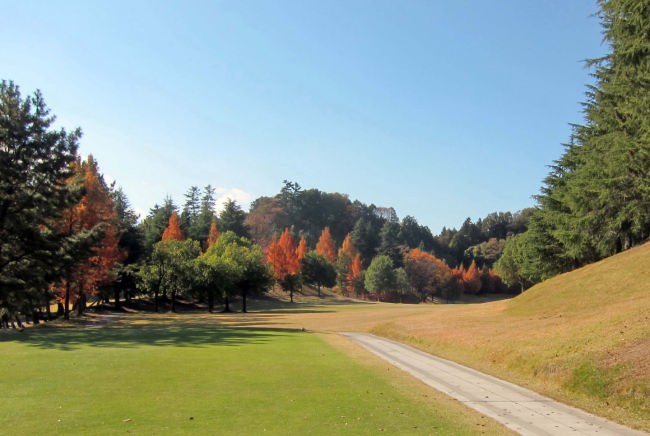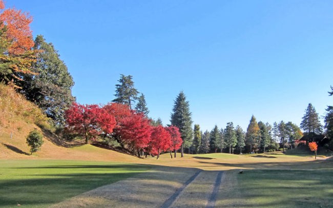 このコースには、楓が殆んどありません。フェアウェーの中央の芝は緑色の着色がされています。 |