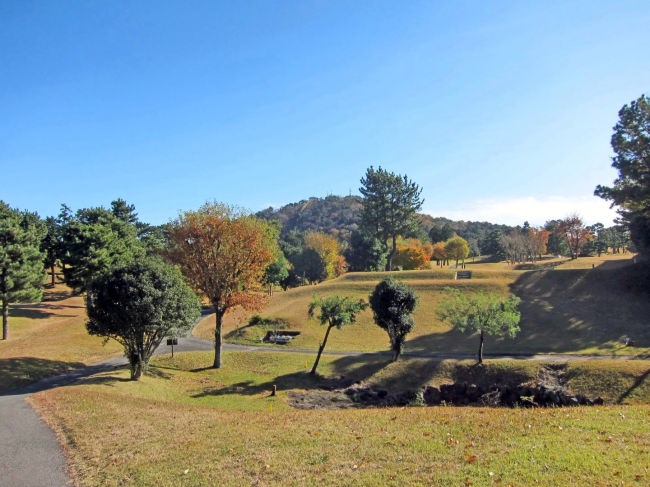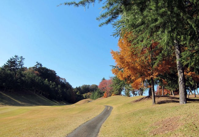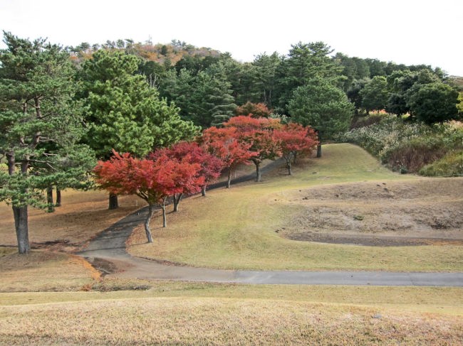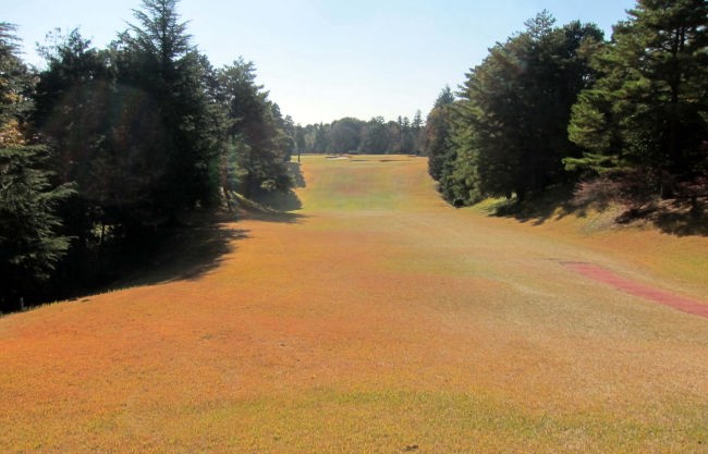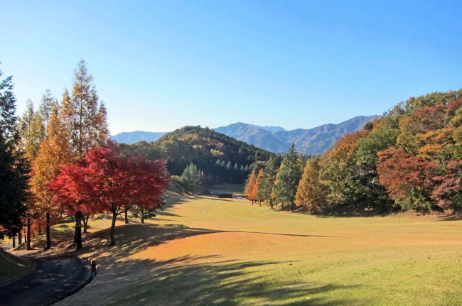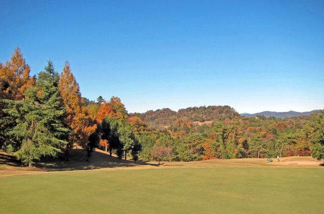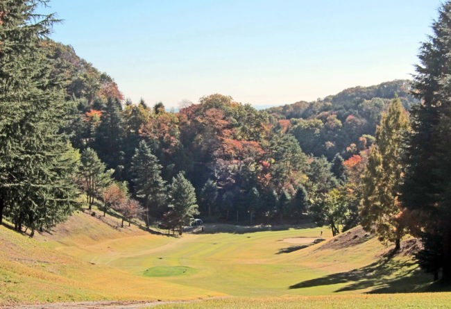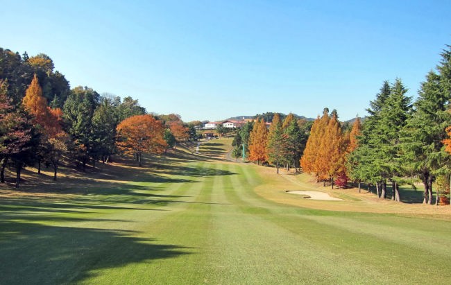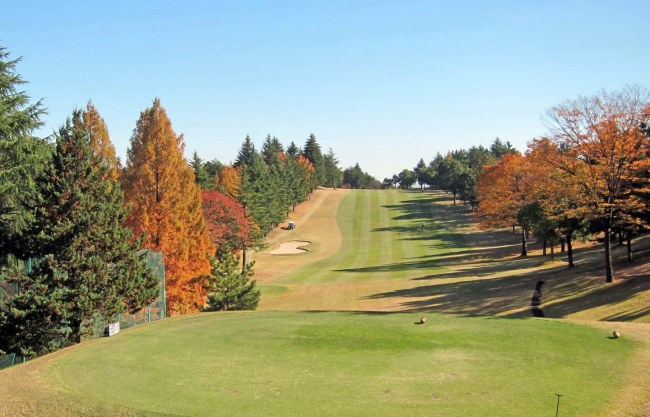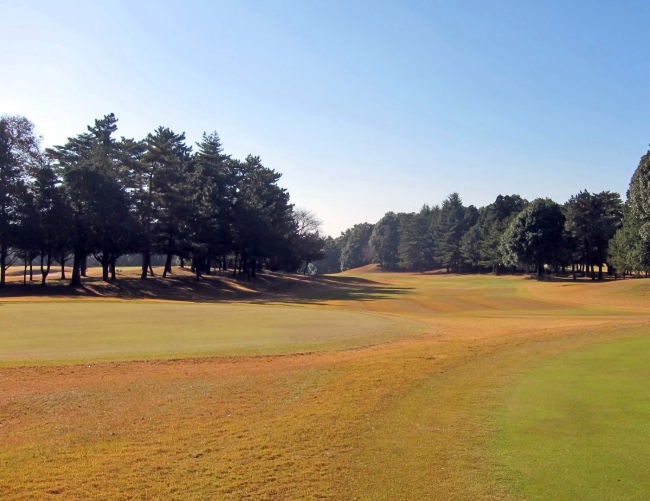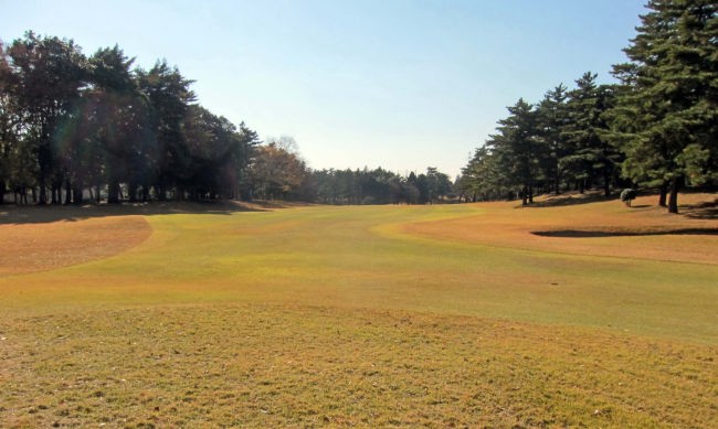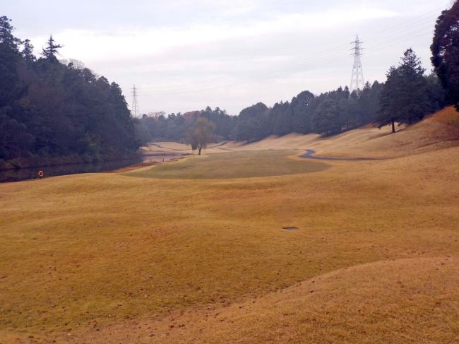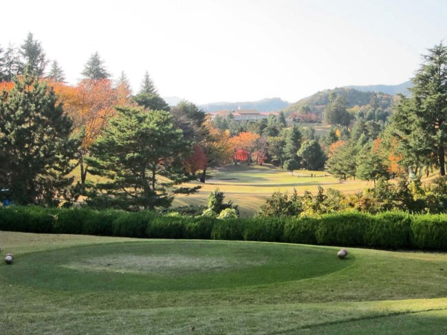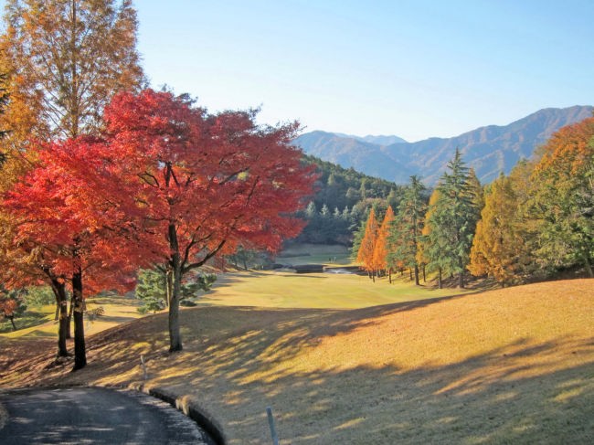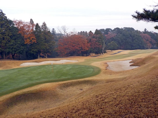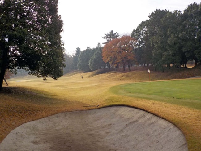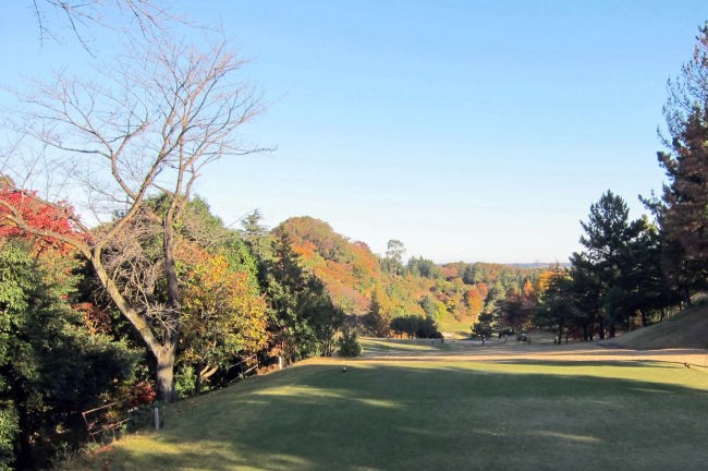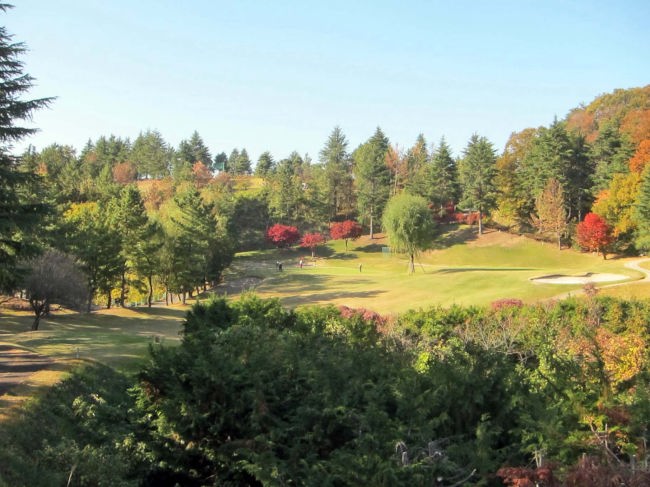 このコースには、楓が殆んどありません。フェアウェーの中央の芝は緑色の着色がされています。 |