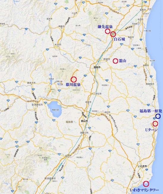 6号線を北上し、福島第一原発に近づくと、たくさんの警備員がおり、一時帰宅許可証を持っていないと、これ以上は北上できないと言われ、Uターンして、今夜の宿泊地、幕川温泉に向かいました。警備員のいた付近のガソリンスタンドや商店などは商売にならないためか、すべて閉鎖されていましたので、仮に帰宅できたとしても、生活は大変だろうと思います。