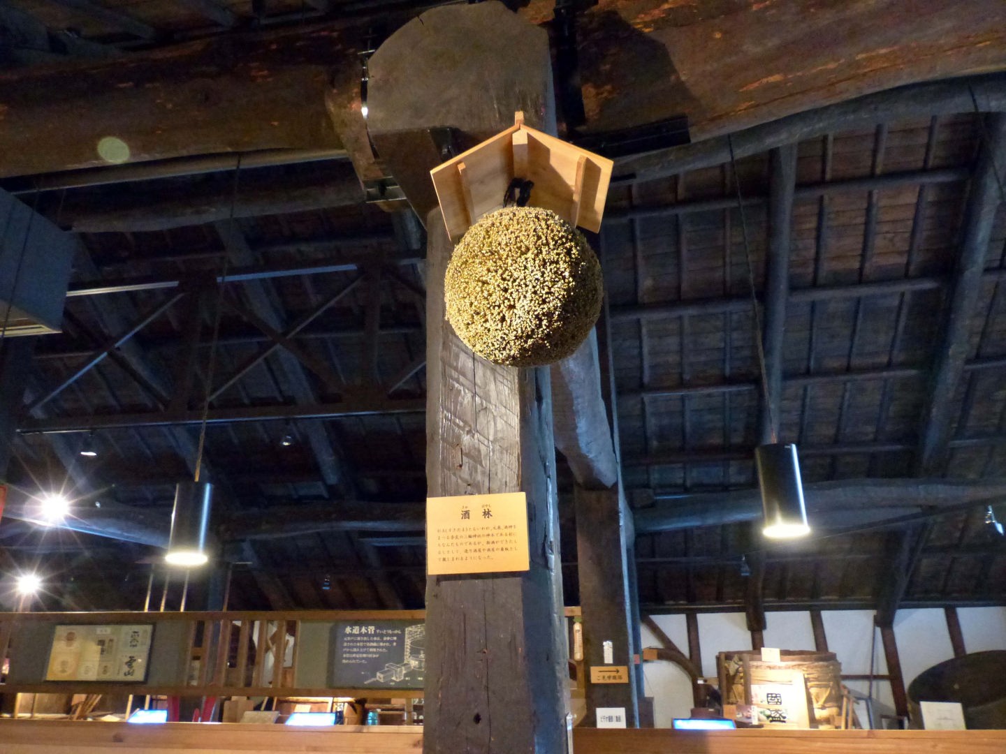 二階に上ると、杉玉が飾ってありました。朝ドラの「まっさん」で出てきた杉玉はかなりの大きさでしたが、この杉玉は直径が30cmぐらいでした。杉玉は杉の葉を集めて作りますが、最初は青々としており、それは新酒が出来たことを知らせるものだそうです。枯れてきて黄色くなるころは、お酒もかなり熟成されているとのことです。