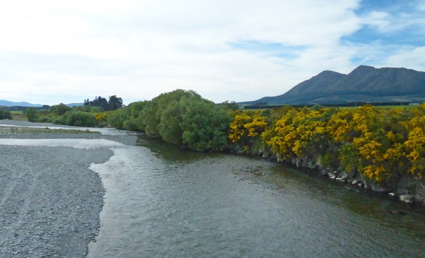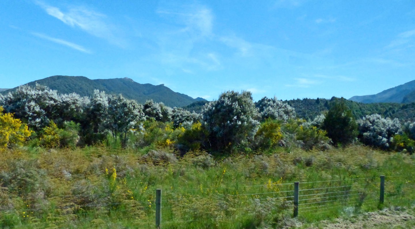 沿道にはルピナス、エニシダ、また、マヌカの白い花が満開でした。マヌカの花は養蜂に利用され、その成分によって値段がかなり違うそうです。この花の季節もあと数週間で終わってしまうそうです。 |