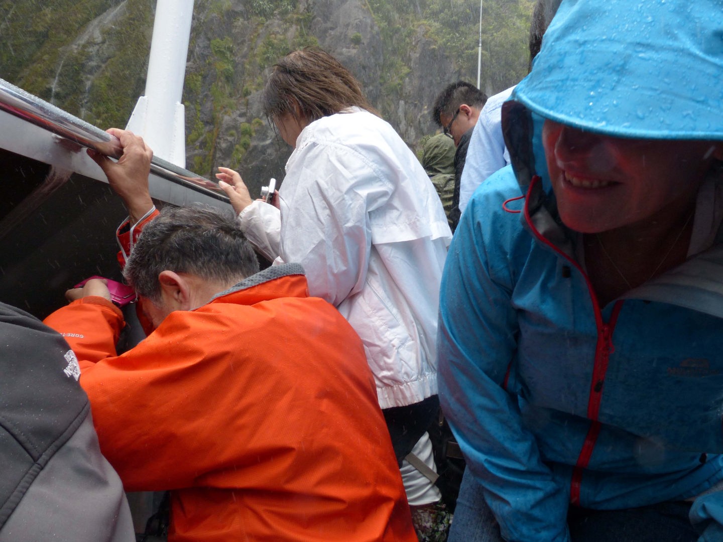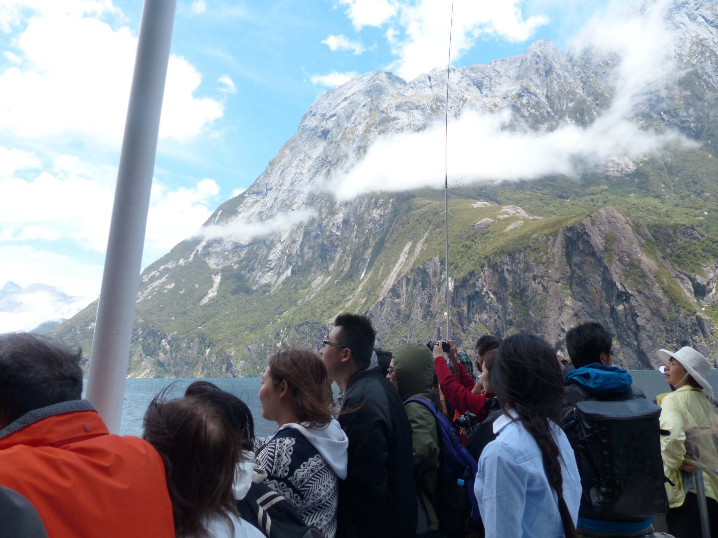 船乗り場からはこの湾のシンボル、マイター・ピークがその頂上まではっきりと見えました。この山の標高は1694mで、海面から鋸の歯のように直接そそり立つ山としては、世界最高峰だそうです。およそ、1万4000年ほど前に氷河が削った山です。乗船直後、船内での昼食でした。食事付の観光船のようです。食後、甲板に出るとものすごい強風で、吹き飛ばされそうです。頑張って一番前に行き、景色を楽しんでいました。甲板には、まだ、2,3名しか居ませんでした。