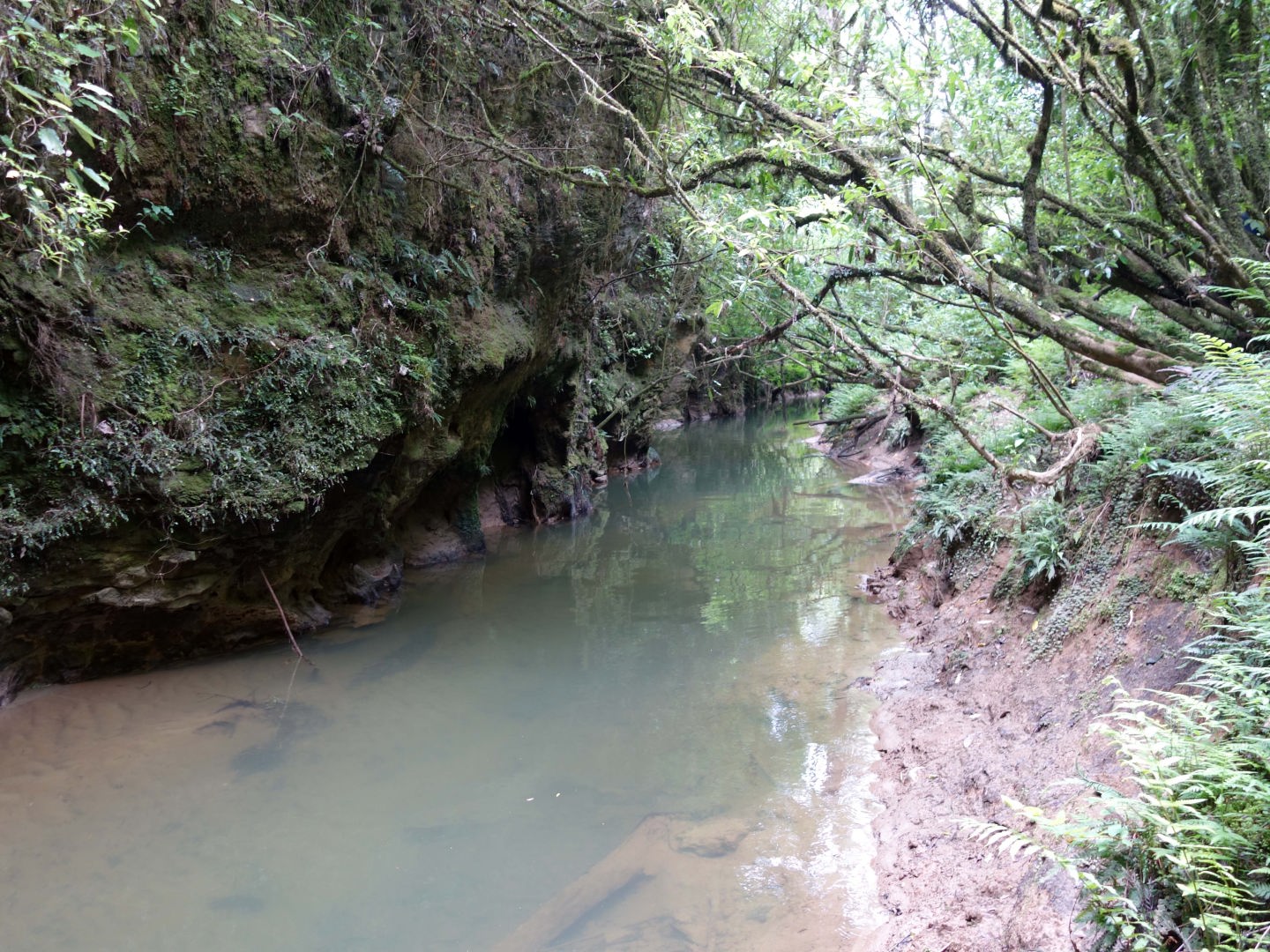 急流による浸食で深く削られた小川があり、また、滝もある面白い景観です。この辺りは年間200日も雨が降るそうです。