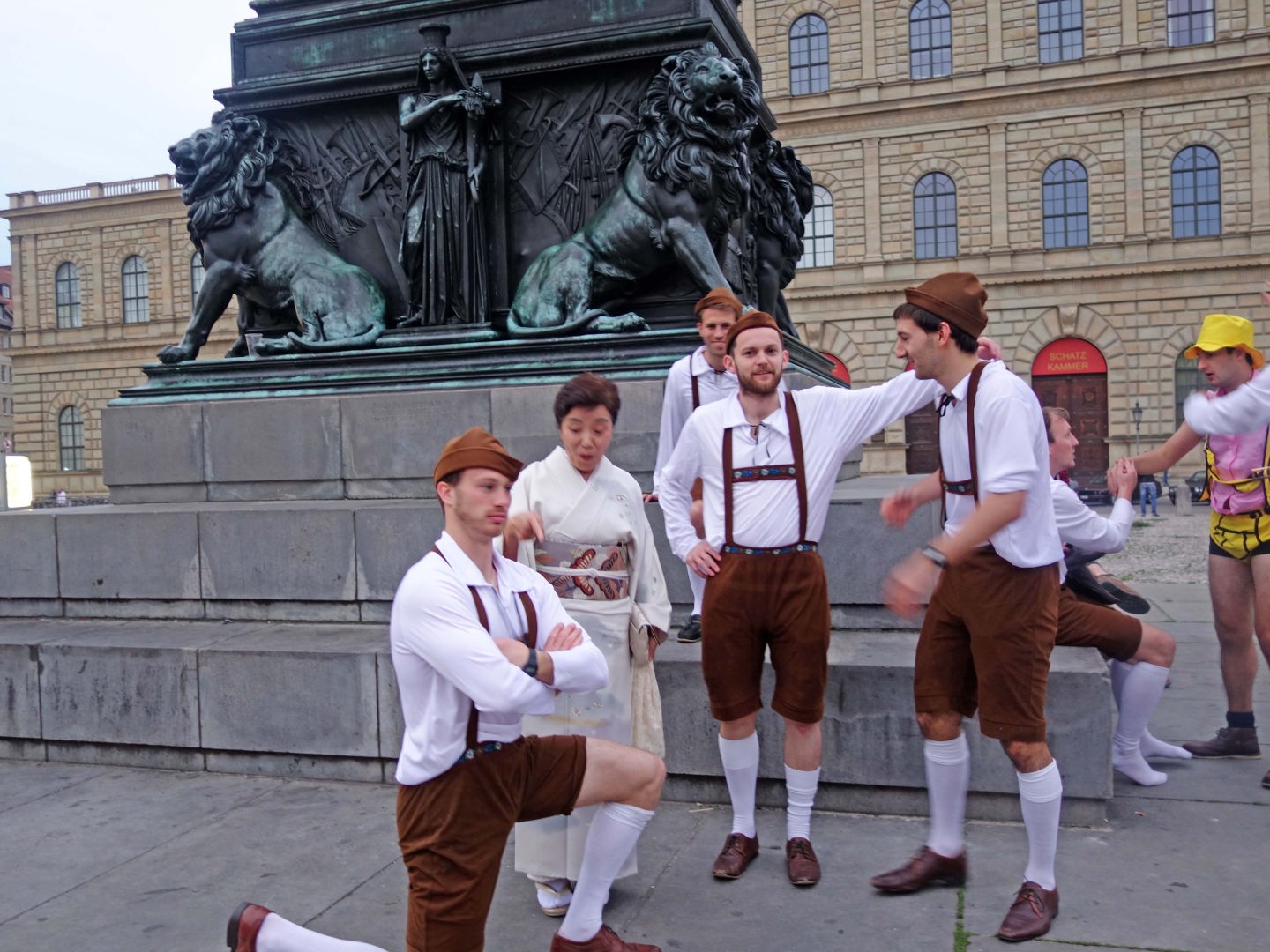 ドイツアルプスから戻り、デナーパーティに出席後、ミュンヘンのレジデンス前の広場を歩いていたところ、青年たちが集まって来て、和服を着た家内を囲んでポーズを取ってくれました。和服の威力は絶大でした。 |