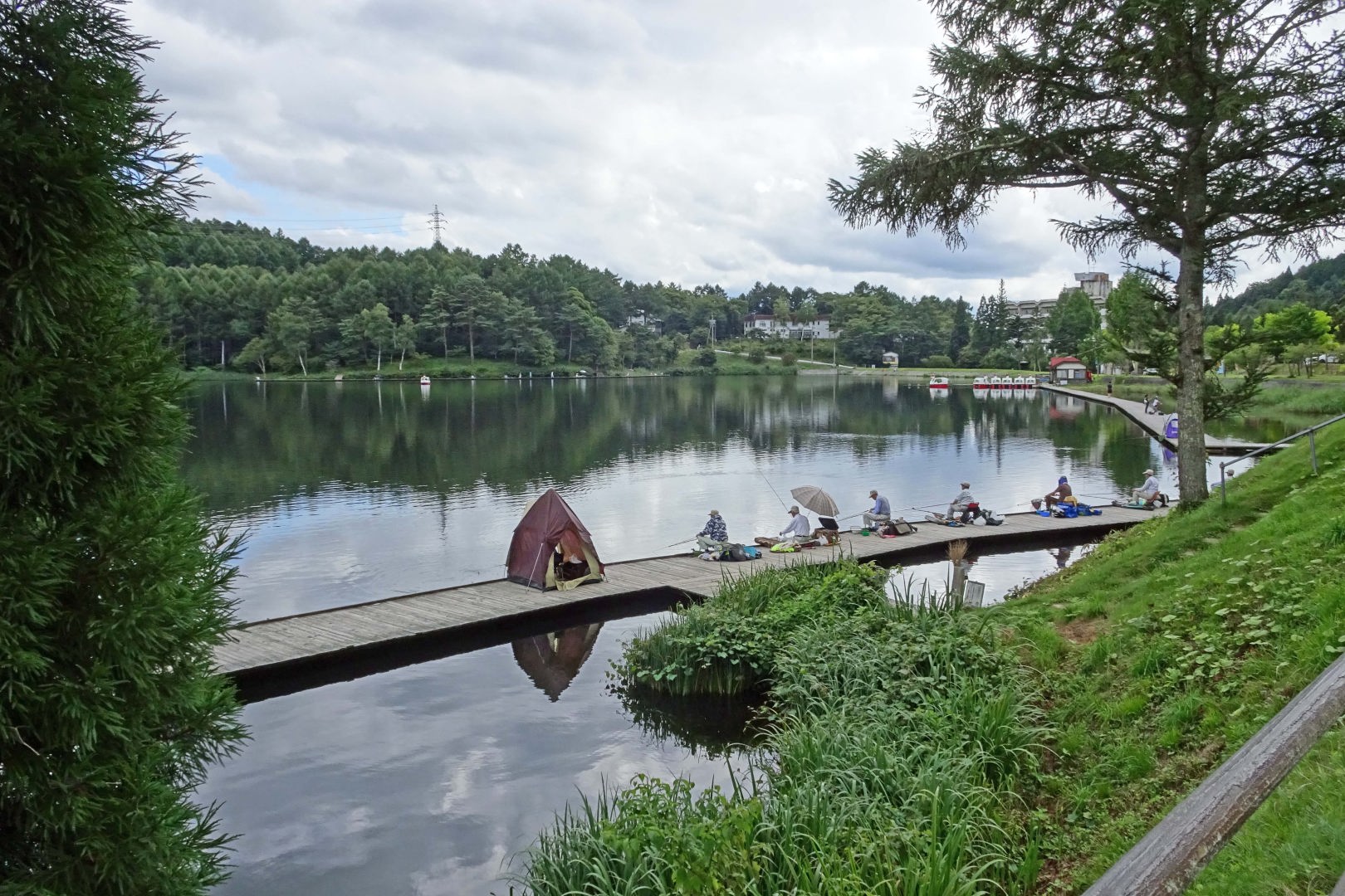 | ゴルフ場を後にし今夜の宿に向かい、山を登って行くと山頂近くに聖湖が現れました。皆さん、釣り堀を楽しんでいるようでした。 |