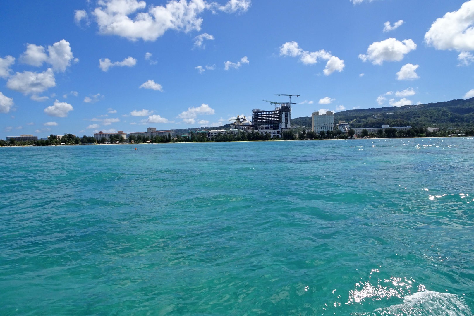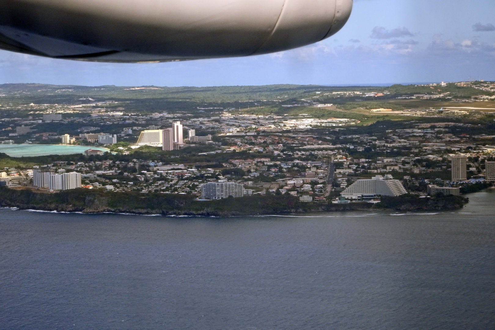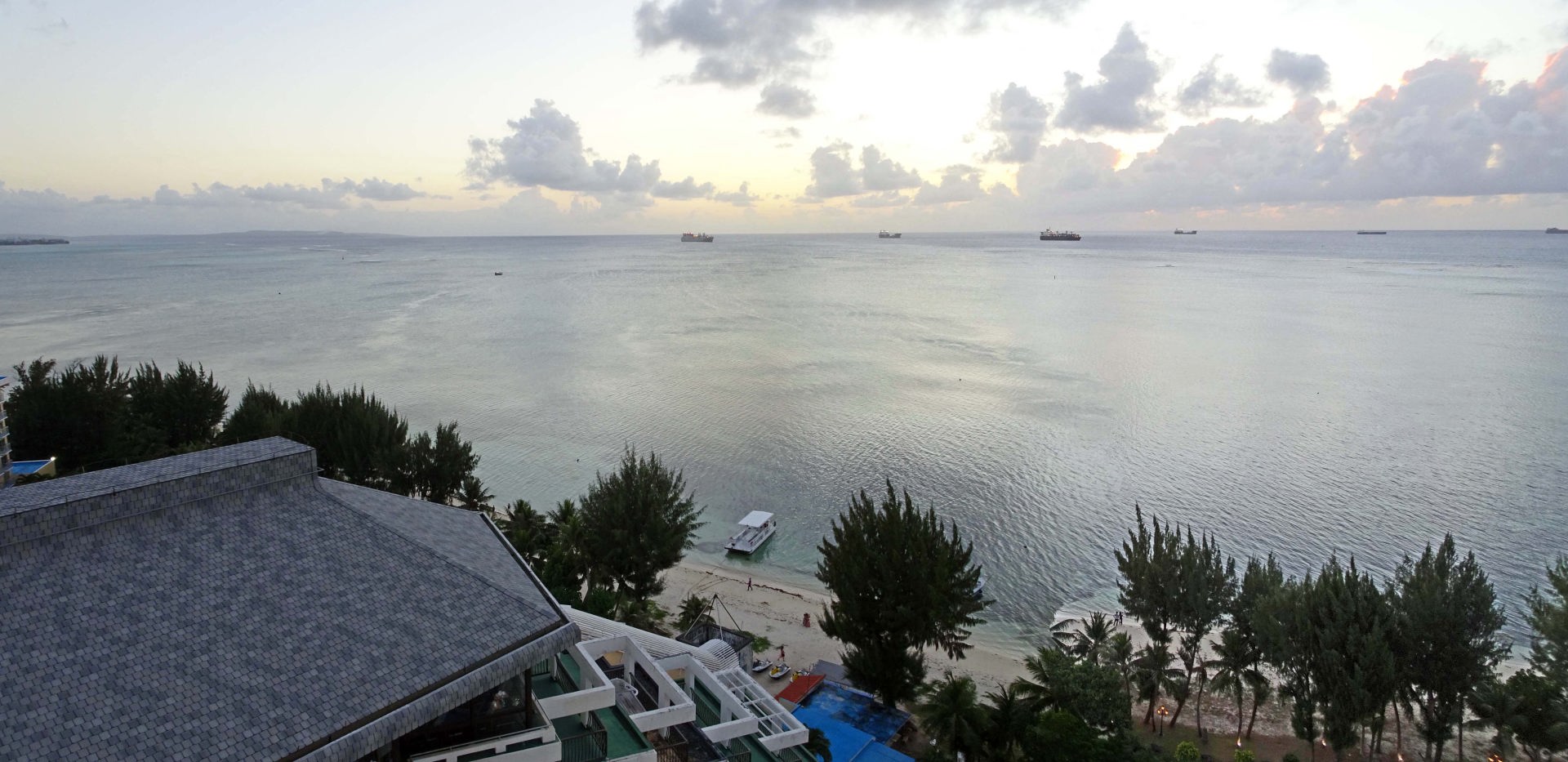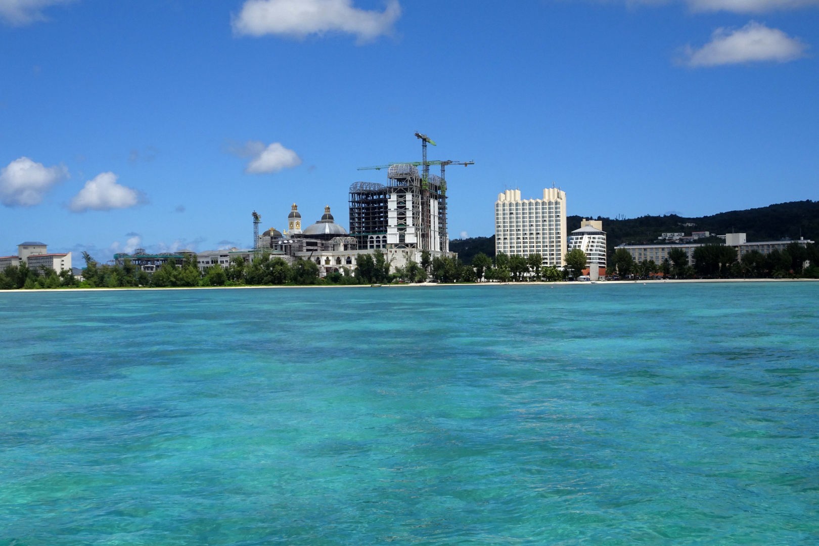 グアム島に近づきました。海岸にはたくさんのホテルが建っているようです。