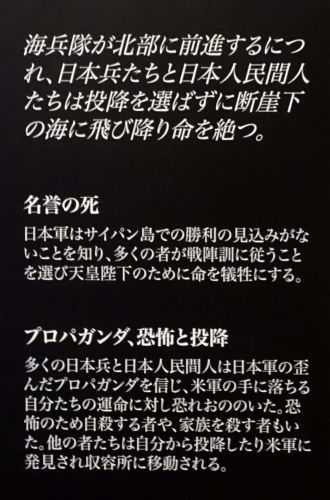 日本軍は玉砕攻撃によりほとんどが戦死し、残された婦女子や老人たちはアメリカ軍の制止の声を背に次々とこの断崖から身を投げたそうです。
